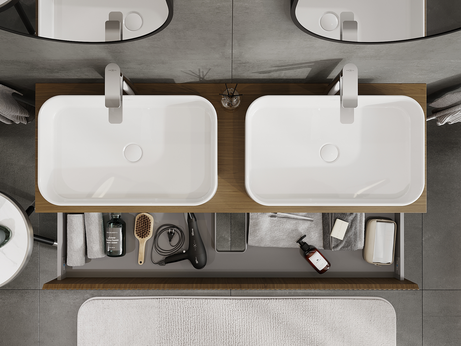 Izrez v predalu je zasnovan tako, da sprejme sifon, ki je nujen v umivalniških instalacijah. S tem je mogoče pohištvo popolnoma funkcionalno namestiti, ne da bi se morali odpovedati prostoru v predalu zaradi instalacije.
