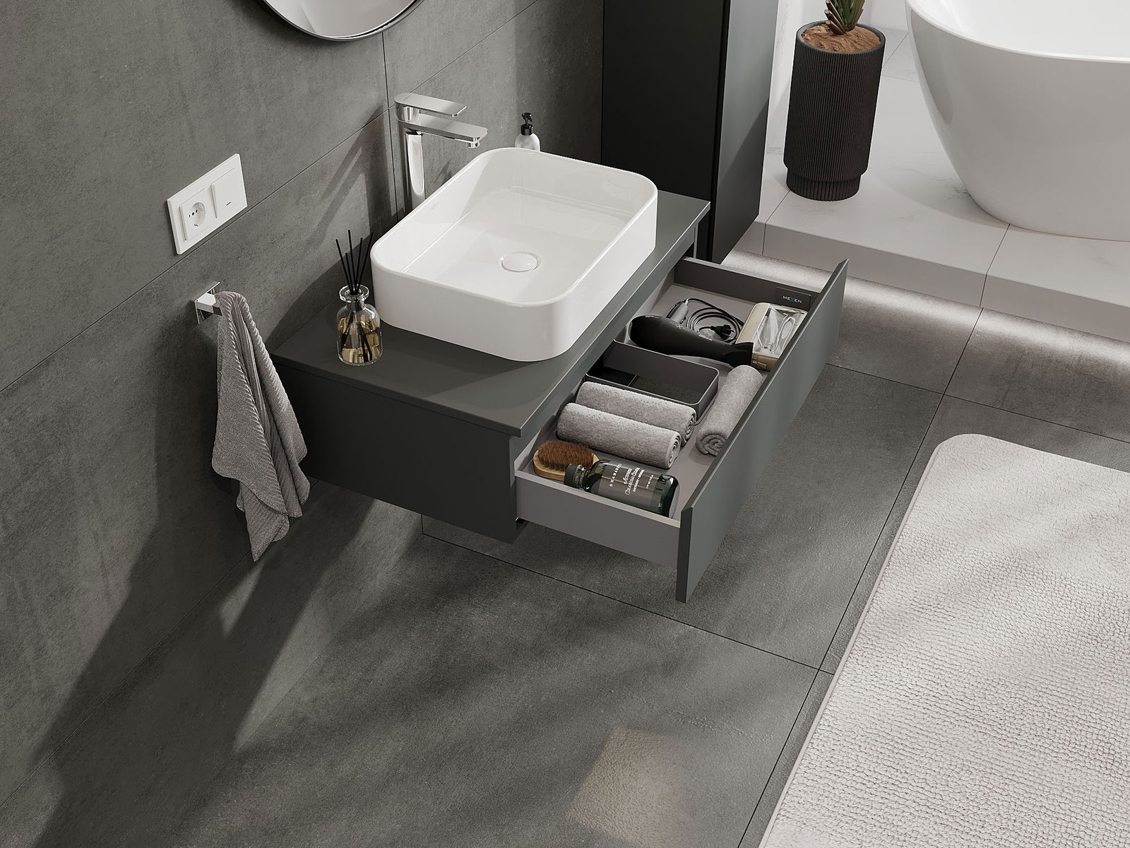 Zaradi trdnih materialov, natančne izdelave in sodobnih tehnoloških rešitev izdelek zagotavlja udobje uporabe, odpornost proti vlagi in spremembam temperature, pa tudi eleganten videz, ki se prilega različnim slogom kopalnic.