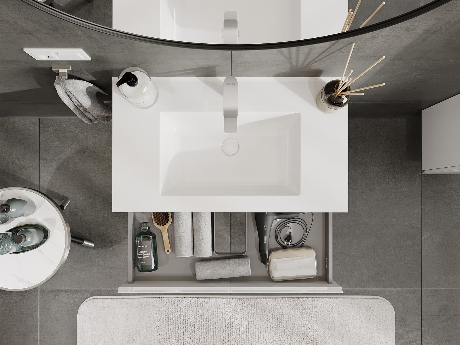 Izrez v predalu je zasnovan tako, da sprejme sifon, ki je nujen v umivalniških instalacijah. S tem je mogoče pohištvo popolnoma funkcionalno namestiti, ne da bi se morali odpovedati prostoru v predalu zaradi instalacije.