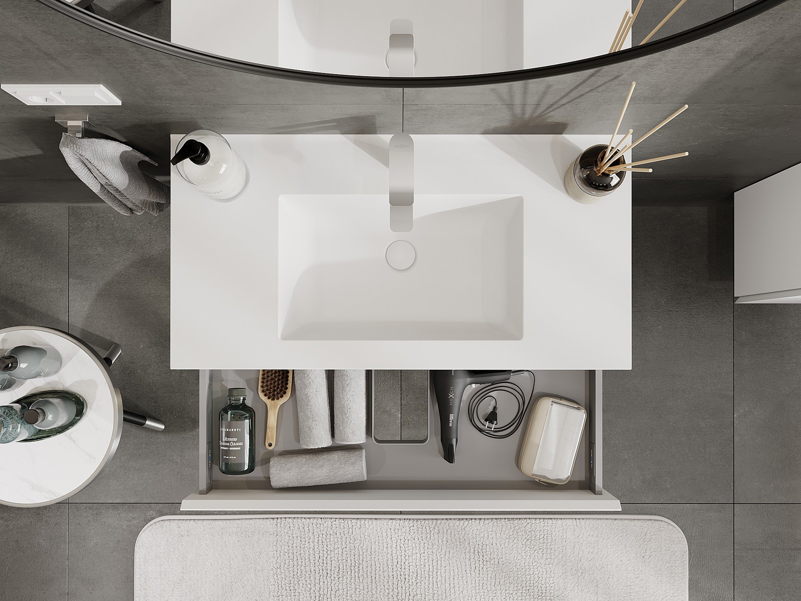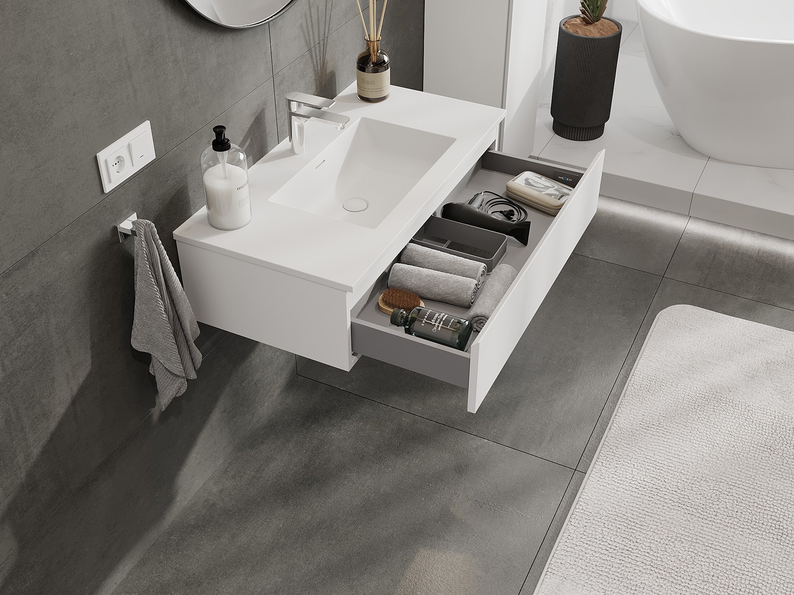 Izrez v predalu je zasnovan tako, da sprejme sifon, ki je nujen v umivalniških instalacijah. S tem je mogoče pohištvo popolnoma funkcionalno namestiti, ne da bi se morali odpovedati prostoru v predalu zaradi instalacije.