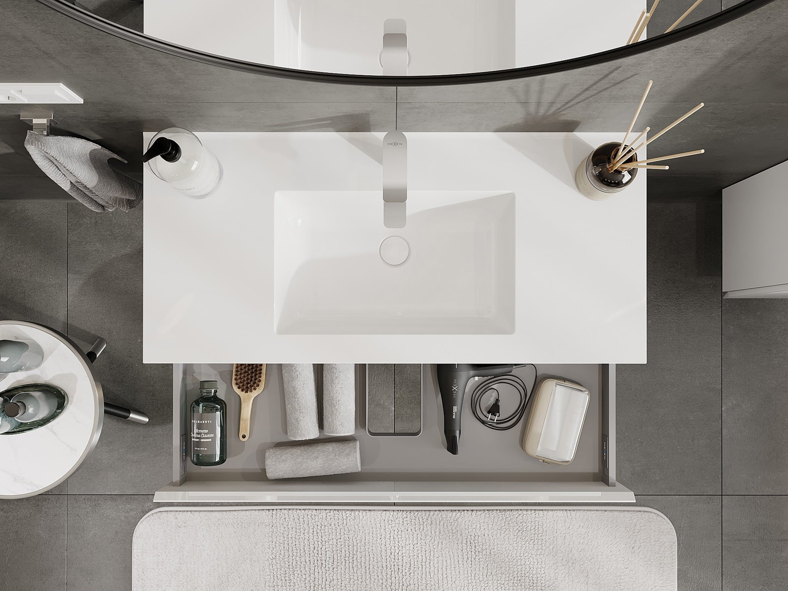 Izrez v predalu je zasnovan tako, da sprejme sifon, ki je nujen v umivalniških instalacijah. S tem je mogoče pohištvo popolnoma funkcionalno namestiti, ne da bi se morali odpovedati prostoru v predalu zaradi instalacije.