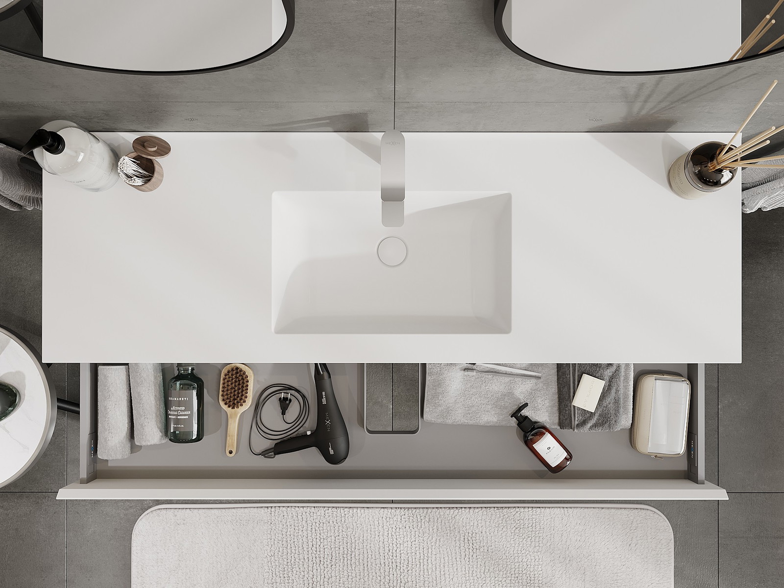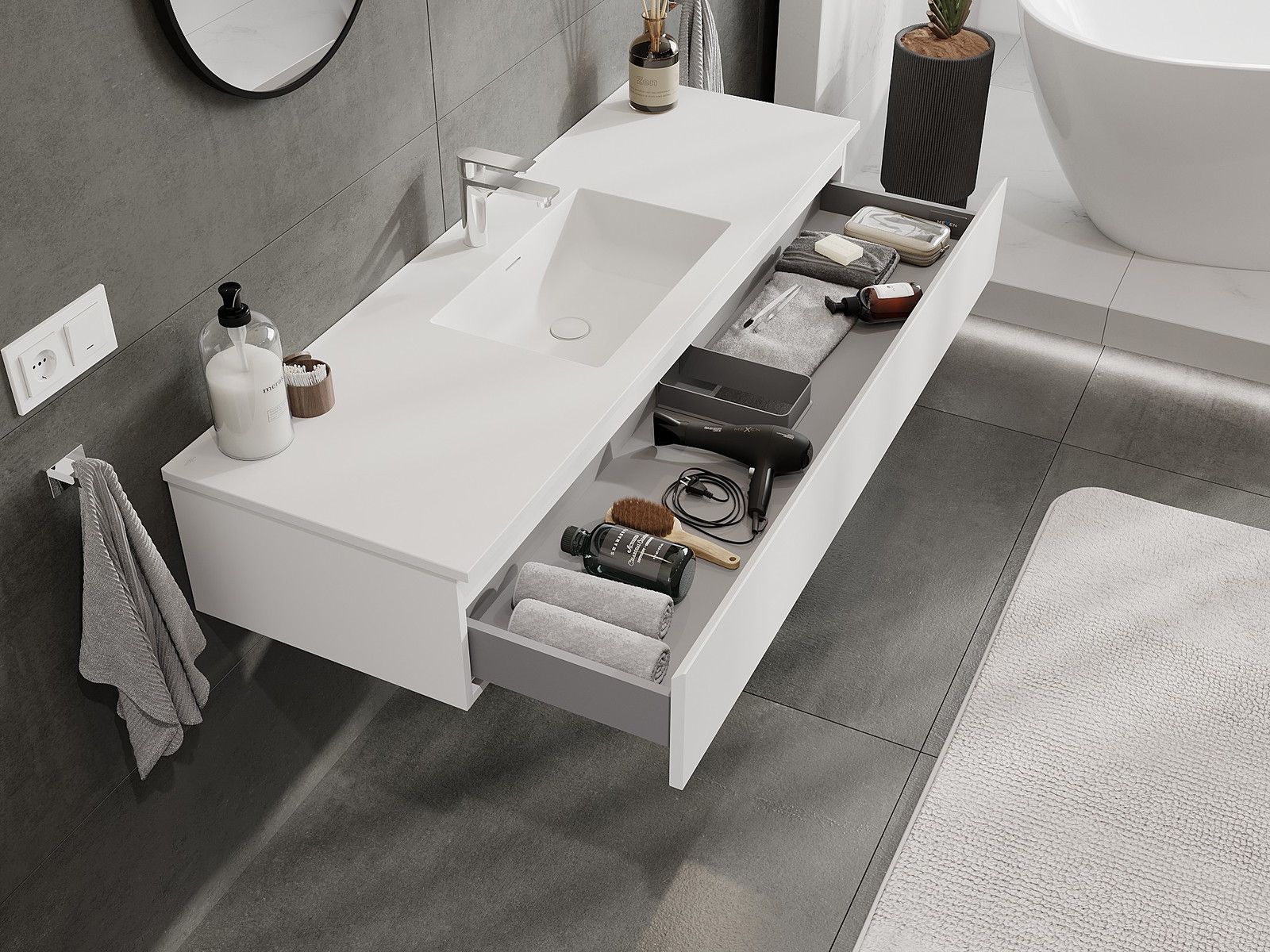 Izrez v predalu je zasnovan tako, da sprejme sifon, ki je nujen v umivalniških instalacijah. S tem je mogoče pohištvo popolnoma funkcionalno namestiti, ne da bi se morali odpovedati prostoru v predalu zaradi instalacije.