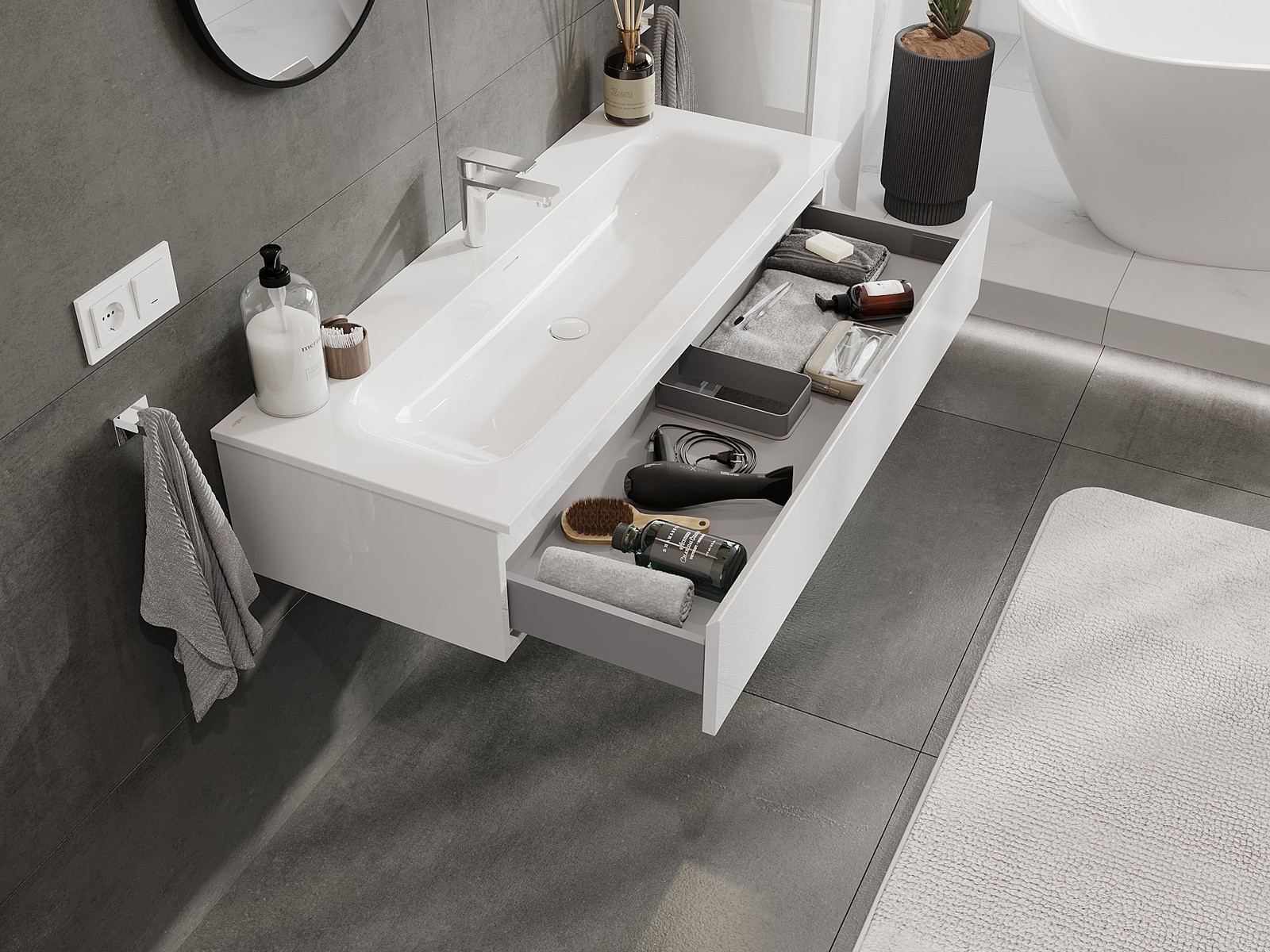 Izrez v predalu je zasnovan tako, da sprejme sifon, ki je nujen v umivalniških instalacijah. S tem je mogoče pohištvo popolnoma funkcionalno namestiti, ne da bi se morali odpovedati prostoru v predalu zaradi instalacije.