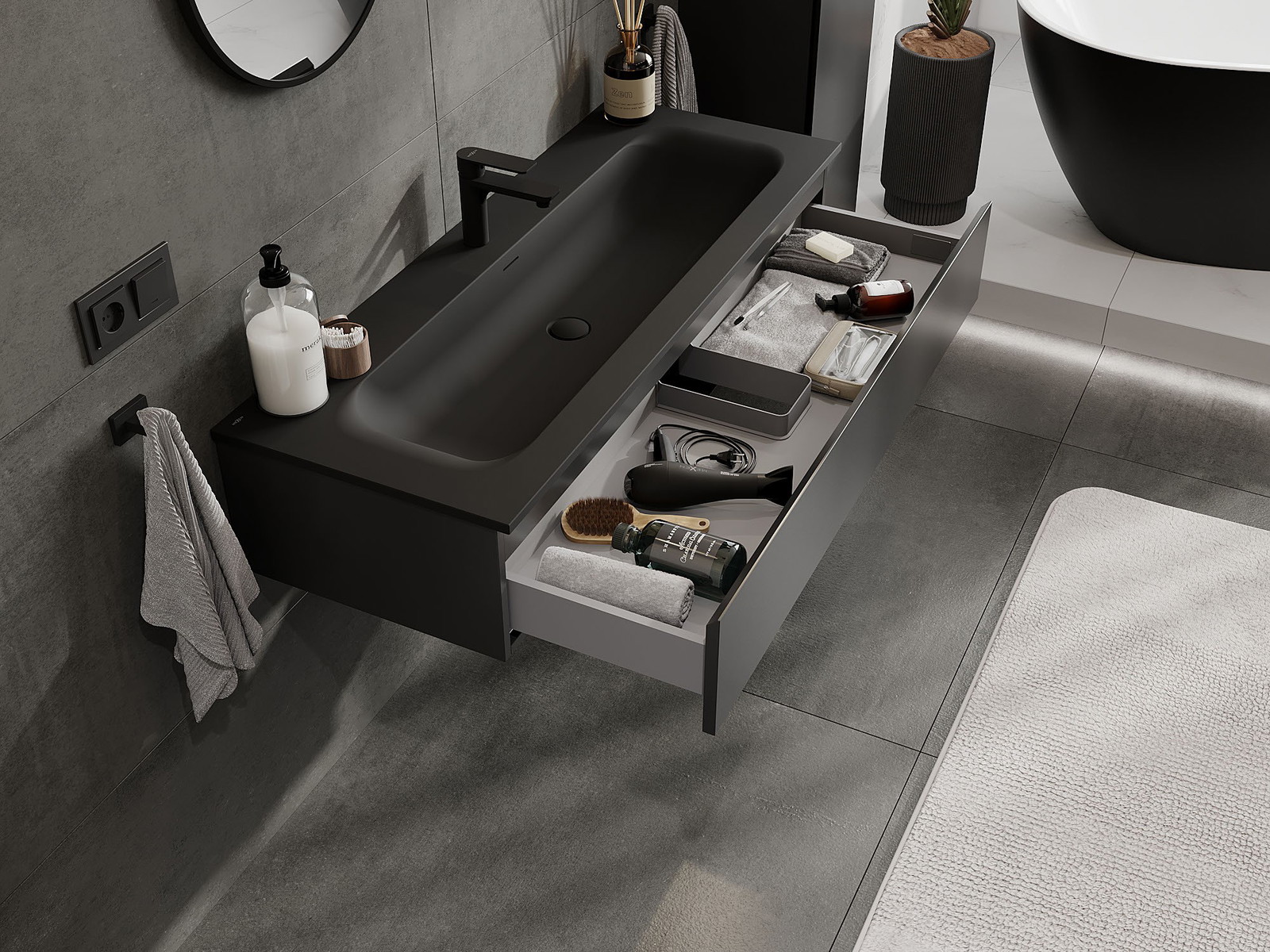 Izrez v predalu je zasnovan tako, da sprejme sifon, ki je nujen v umivalniških instalacijah. S tem je mogoče pohištvo popolnoma funkcionalno namestiti, ne da bi se morali odpovedati prostoru v predalu zaradi instalacije.