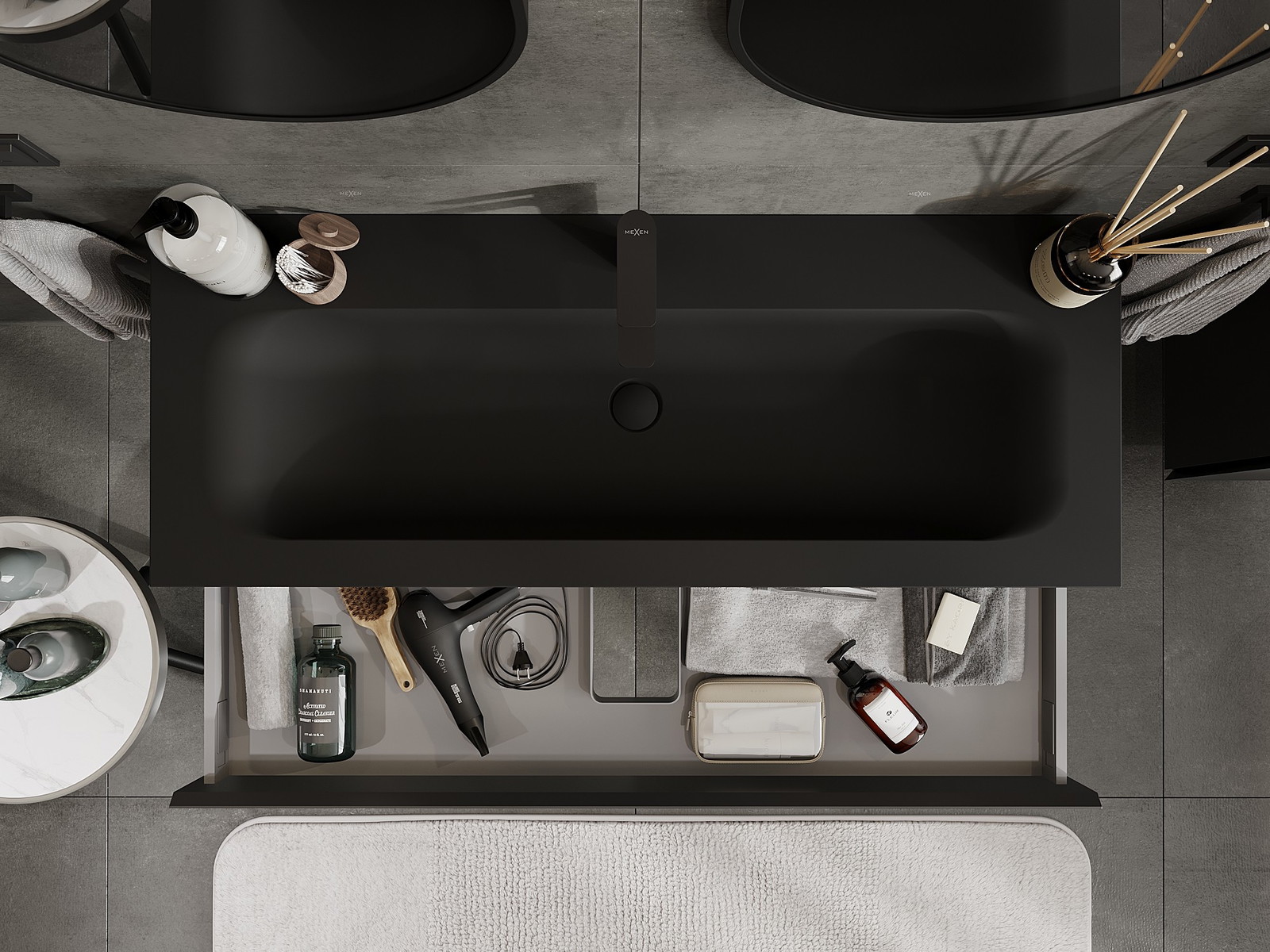 Mexen Orio kopalniška omarica 120 cm z umivalnikom Vela, 1 predal, črna mat - 91A10-12023-1-BF71-W23M71