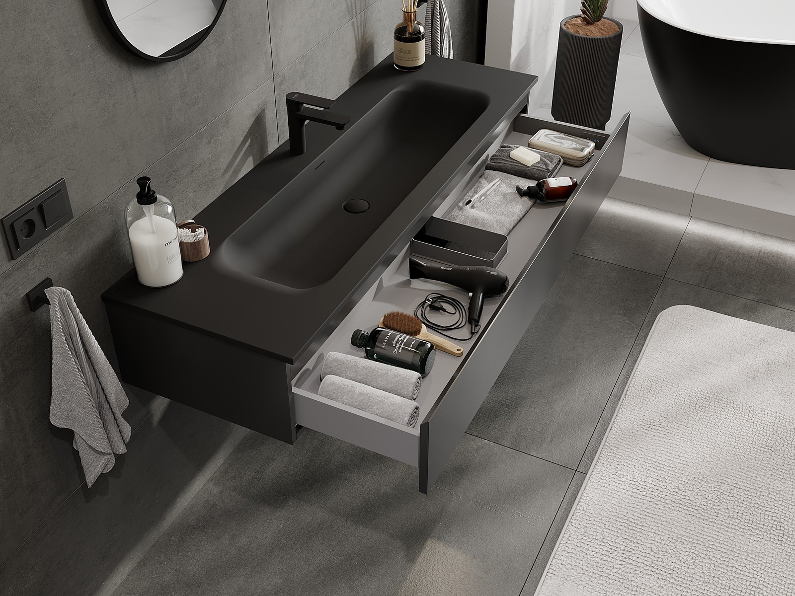 Mexen Orio kopalniška omarica 140 cm z umivalnikom Vela, 1 predal, črna mat - 91A10-14023-1-BF71-W23M71