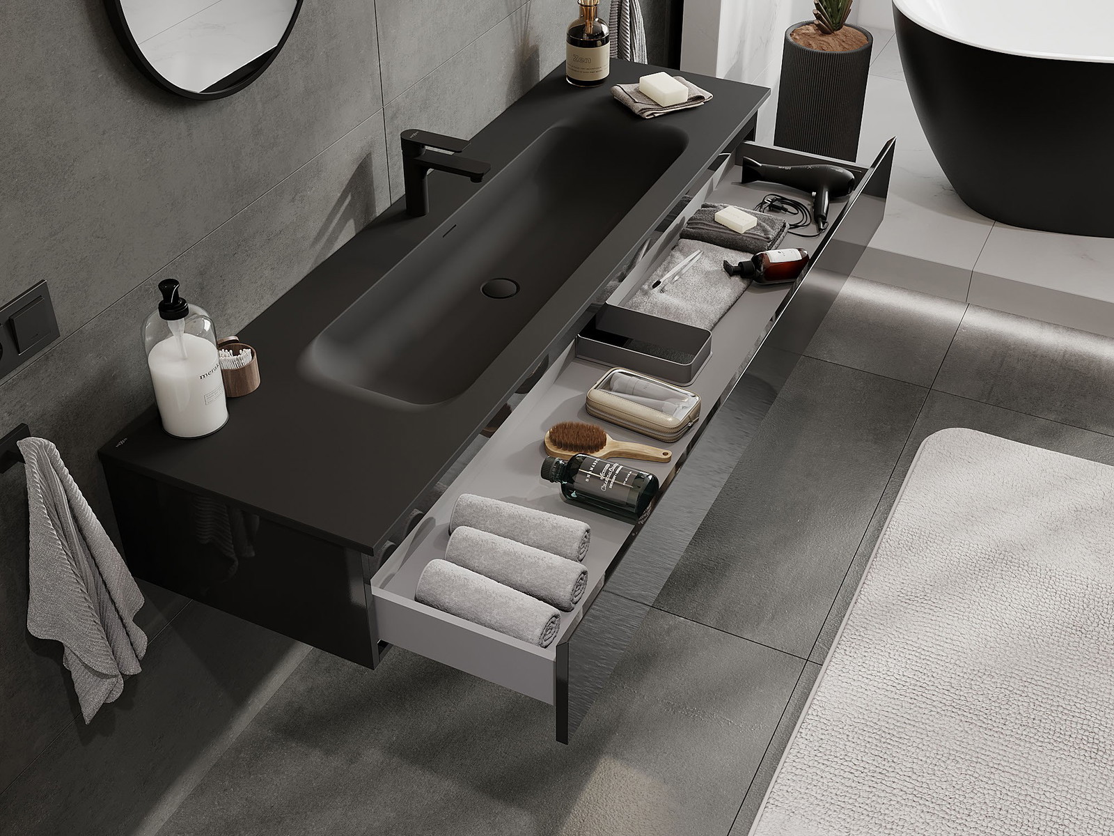 Izrez v predalu je zasnovan tako, da sprejme sifon, ki je nujen v umivalniških instalacijah. S tem je mogoče pohištvo popolnoma funkcionalno namestiti, ne da bi se morali odpovedati prostoru v predalu zaradi instalacije.