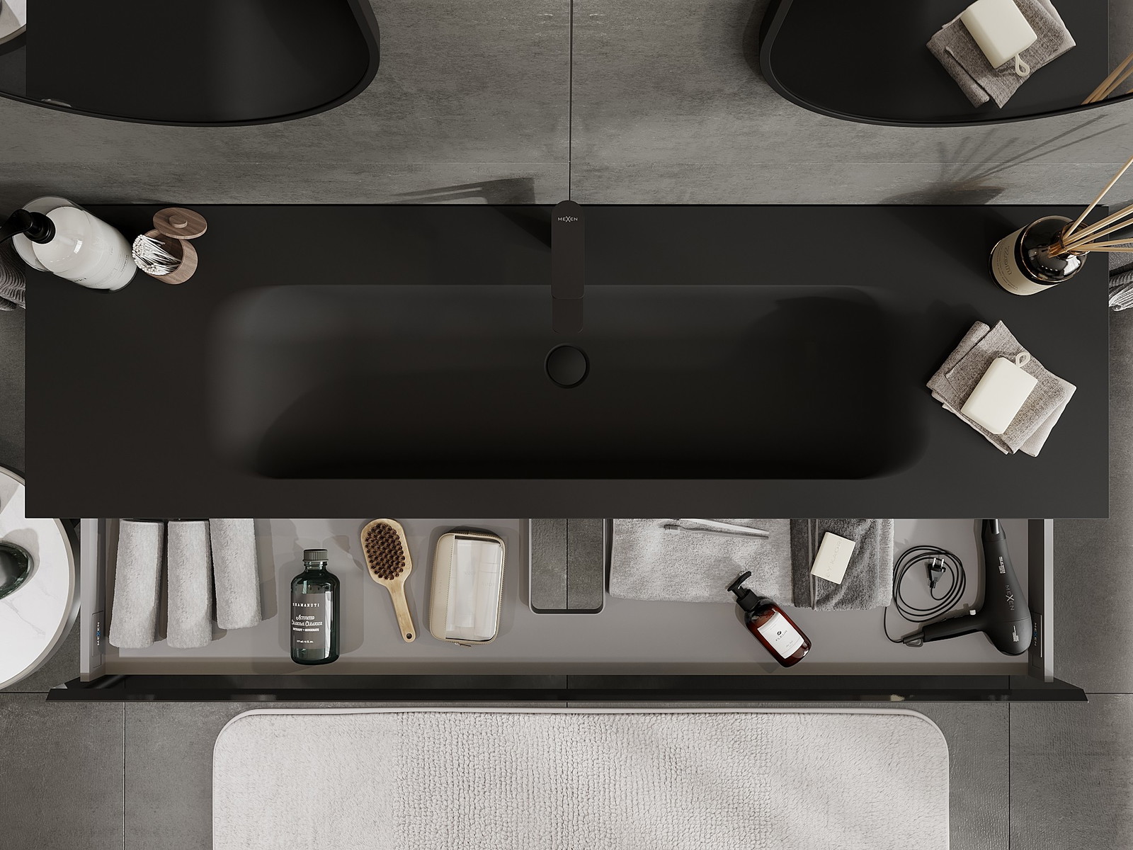 Mexen Orio kopalniška omarica 160 cm z umivalnikom Vela, 1 predal, črna sijaj/črna mat - 91A10-16023-1-BF70-W23M71