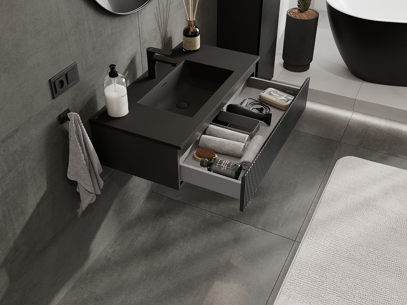 Mexen Rivel kopalniška omarica 90 cm z umivalnikom Otis, 1 predal, rebrasti, črna mat - 91A20-09023-1-BF71-W18M71