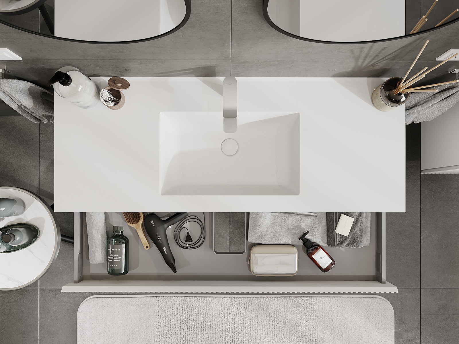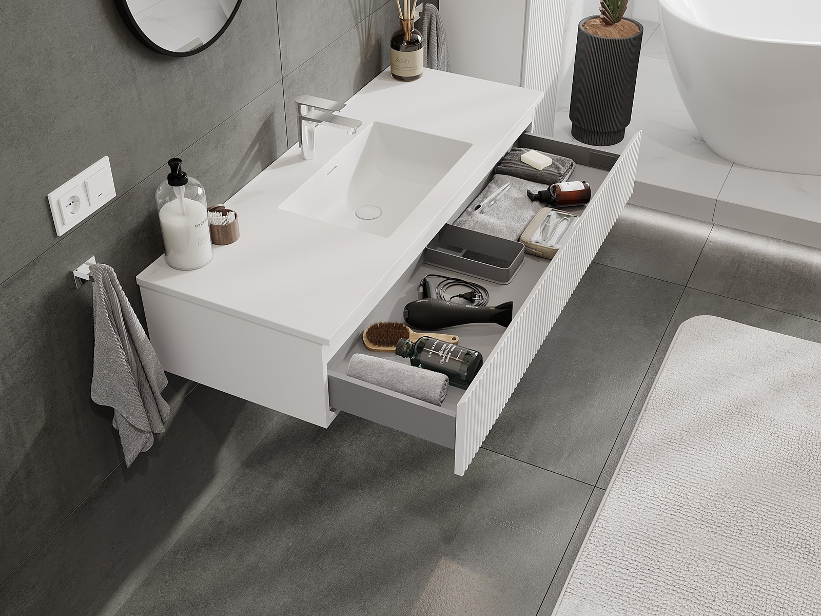 Izrez v predalu je zasnovan tako, da sprejme sifon, ki je nujen v umivalniških instalacijah. S tem je mogoče pohištvo popolnoma funkcionalno namestiti, ne da bi se morali odpovedati prostoru v predalu zaradi instalacije.