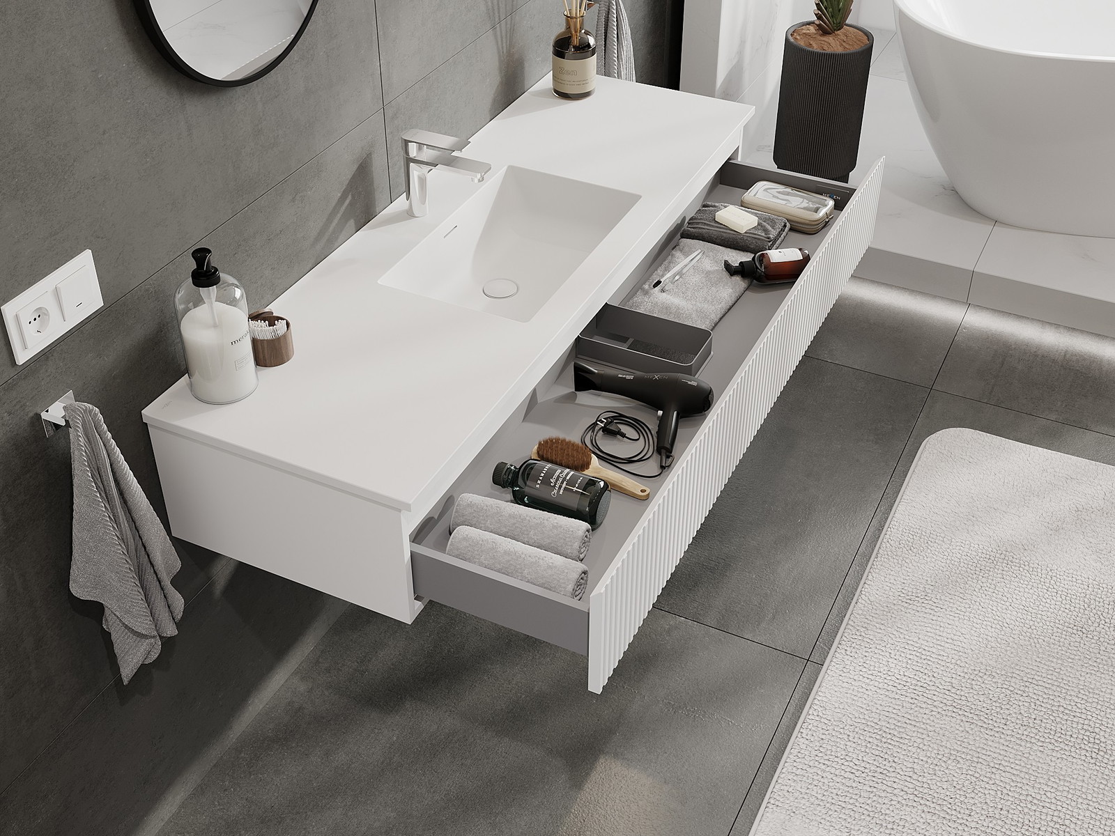 Mexen Rivel kopalniška omarica 140 cm z umivalnikom Otis, 1 predal, z rebrasto strukturo, mat bela - 91A20-14023-1-BF01-W18M01