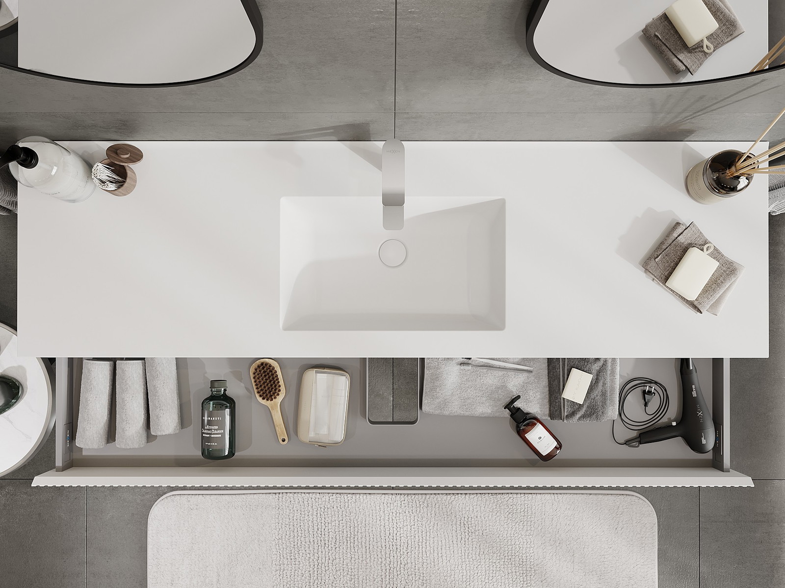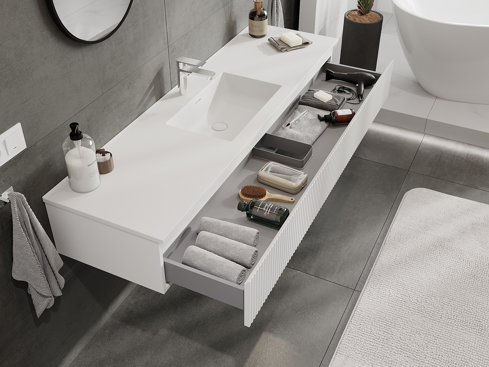 Izrez v predalu je zasnovan tako, da sprejme sifon, ki je nujen v umivalniških instalacijah. S tem je mogoče pohištvo popolnoma funkcionalno namestiti, ne da bi se morali odpovedati prostoru v predalu zaradi instalacije.