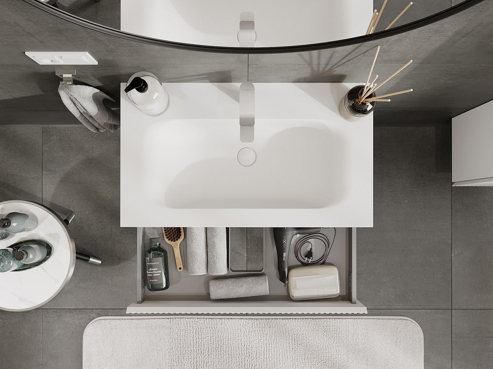Izrez v predalu je zasnovan tako, da sprejme sifon, ki je nujen v umivalniških instalacijah. S tem je mogoče pohištvo popolnoma funkcionalno namestiti, ne da bi se morali odpovedati prostoru v predalu zaradi instalacije.