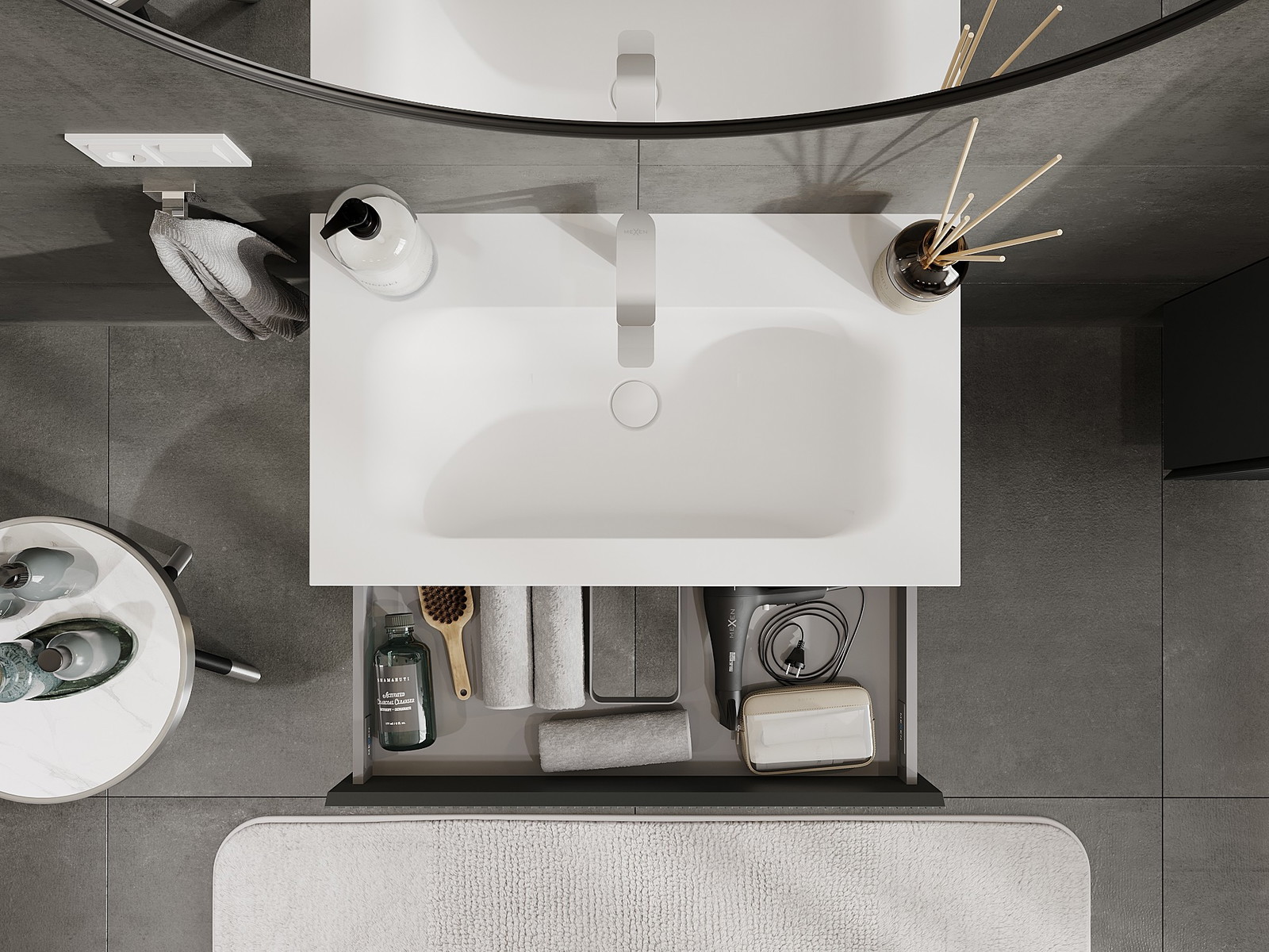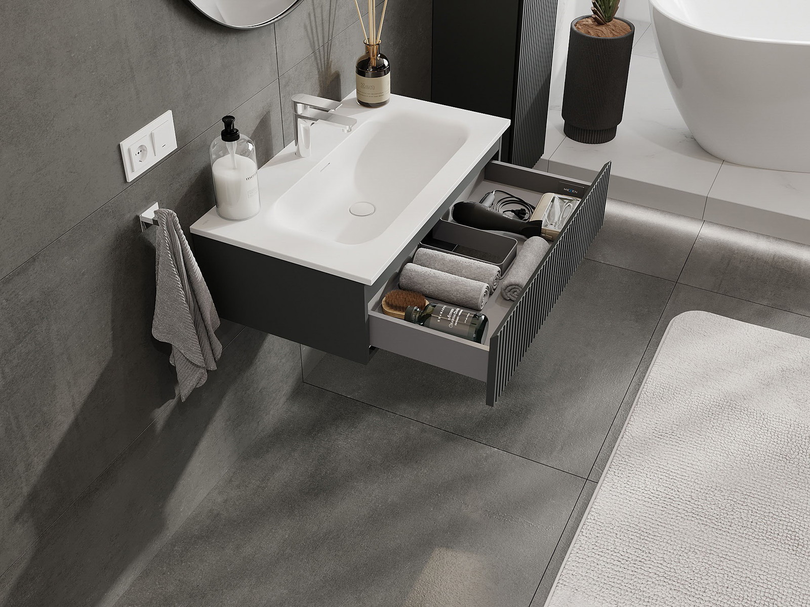 Izrez v predalu je zasnovan tako, da sprejme sifon, ki je nujen v umivalniških instalacijah. S tem je mogoče pohištvo popolnoma funkcionalno namestiti, ne da bi se morali odpovedati prostoru v predalu zaradi instalacije.