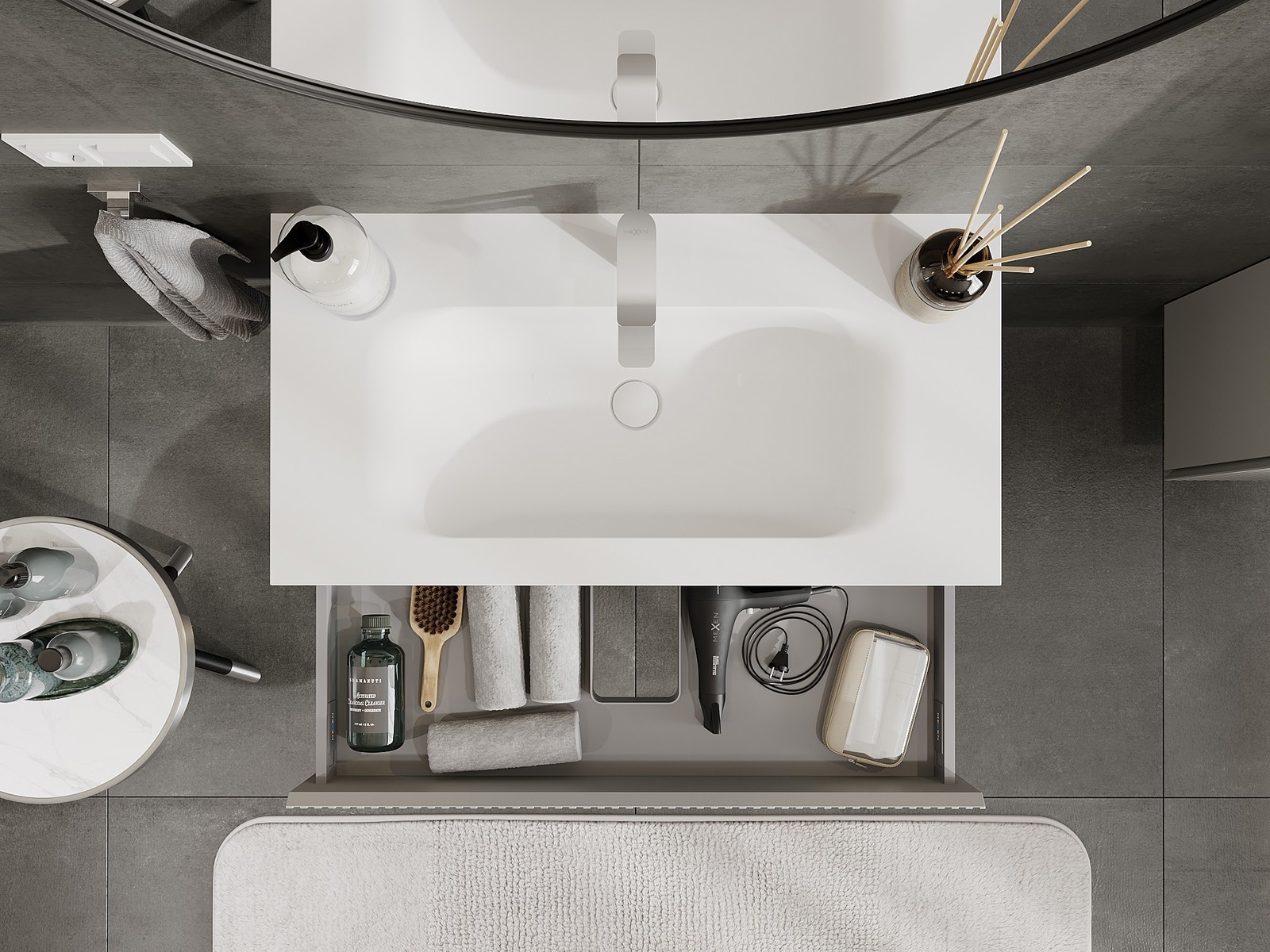 Izrez v predalu je zasnovan tako, da sprejme sifon, ki je nujen v umivalniških instalacijah. S tem je mogoče pohištvo popolnoma funkcionalno namestiti, ne da bi se morali odpovedati prostoru v predalu zaradi instalacije.