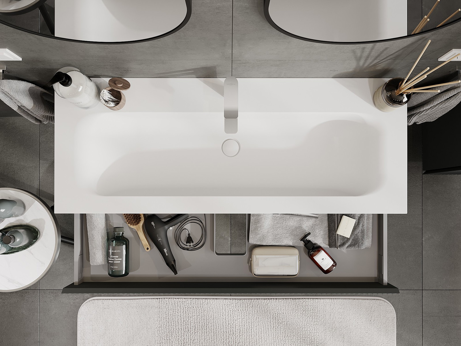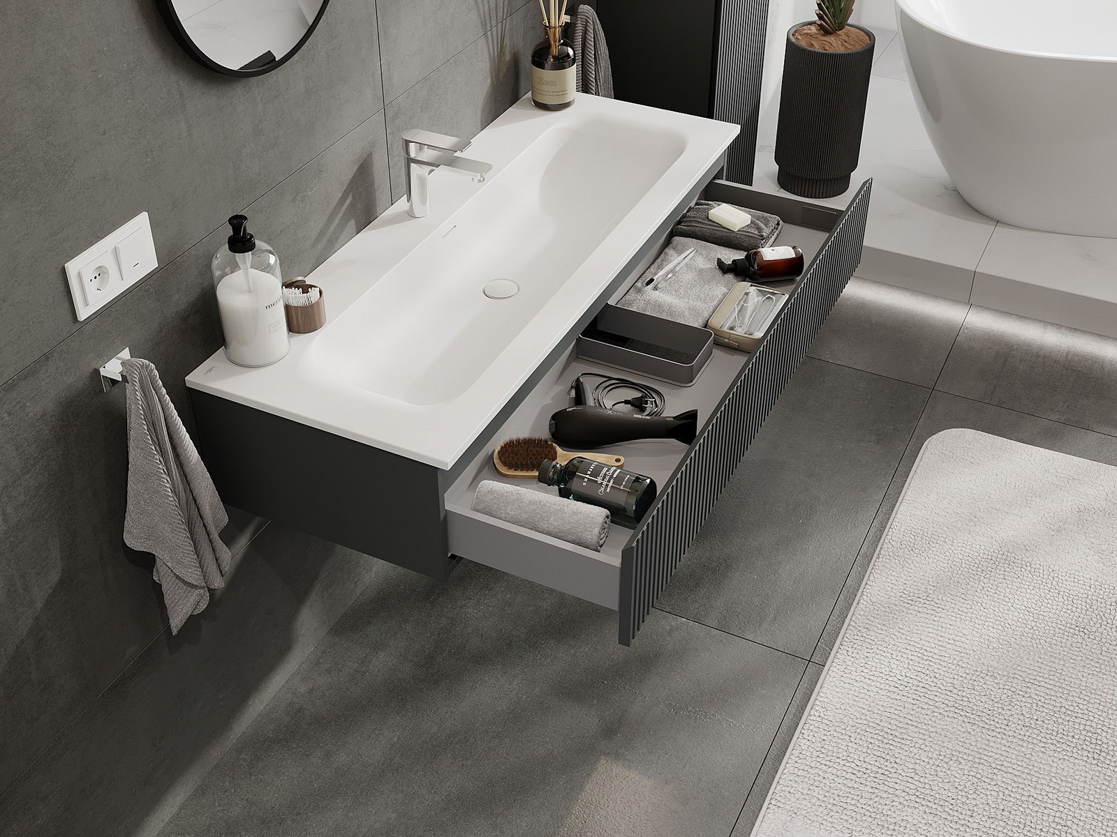 Izrez v predalu je zasnovan tako, da sprejme sifon, ki je nujen v umivalniških instalacijah. S tem je mogoče pohištvo popolnoma funkcionalno namestiti, ne da bi se morali odpovedati prostoru v predalu zaradi instalacije.