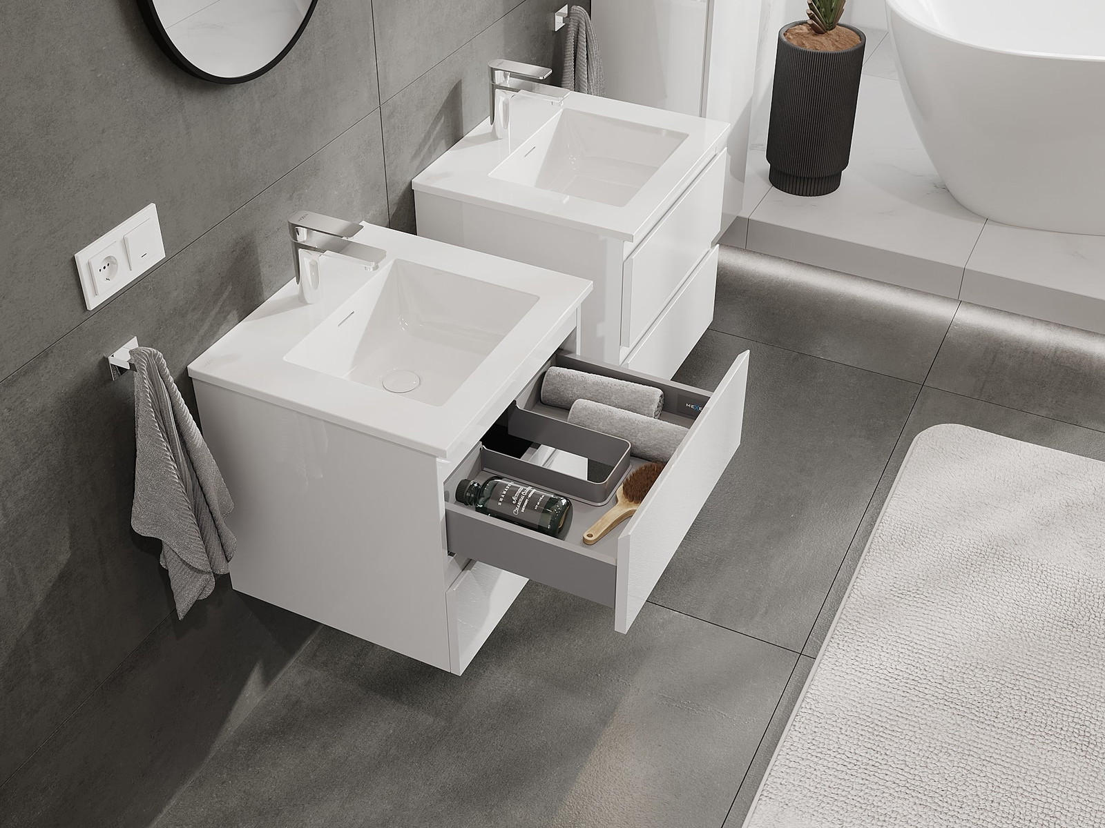 Naše modularno pohištvo za kopalnice je mogoče združevati v različnih barvnih konfiguracijah, kar omogoča popolno personalizacijo. Možno je izbrati tako videz kot funkcije posameznih elementov, kar omogoča prilagoditev pohištva vašim slogovnim in uporabniškim preferencam.