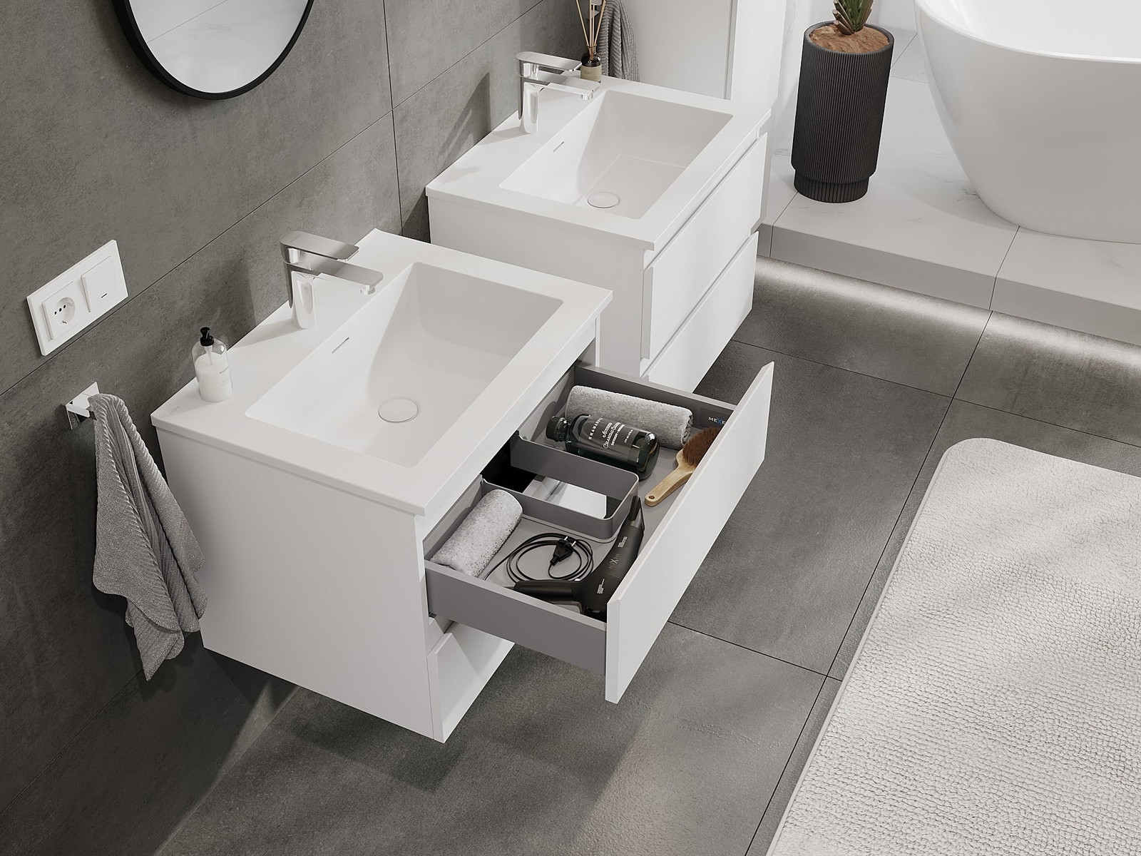 Naše modularno pohištvo za kopalnice je mogoče združevati v različnih barvnih konfiguracijah, kar omogoča popolno personalizacijo. Možno je izbrati tako videz kot funkcije posameznih elementov, kar omogoča prilagoditev pohištva vašim slogovnim in uporabniškim preferencam.