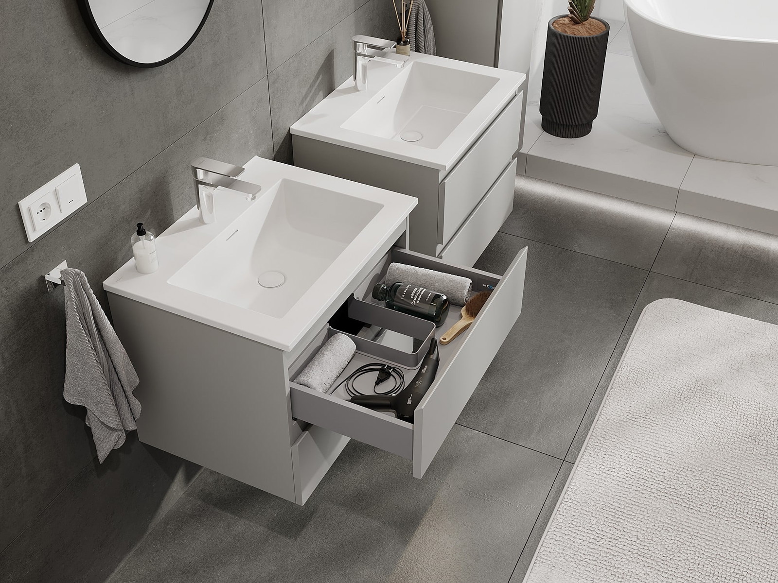 Naše modularno pohištvo za kopalnice je mogoče združevati v različnih barvnih konfiguracijah, kar omogoča popolno personalizacijo. Možno je izbrati tako videz kot funkcije posameznih elementov, kar omogoča prilagoditev pohištva vašim slogovnim in uporabniškim preferencam.