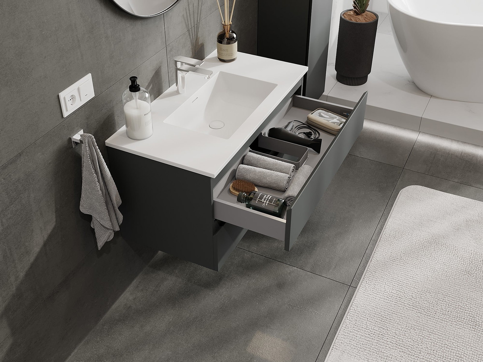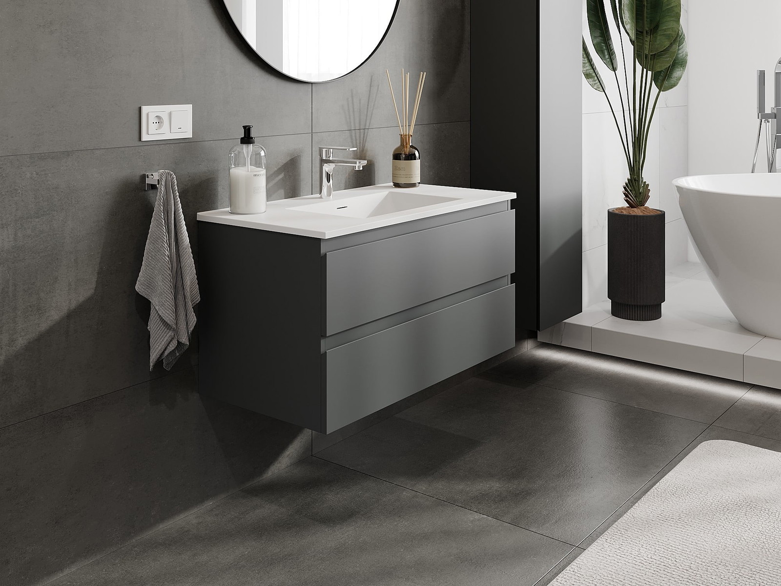 Mexen Orio kopalniška omarica 90 cm z umivalnikom Otis, 2 predala, grafit mat/bela mat - 91A10-09047-2-BFF66-W18M01