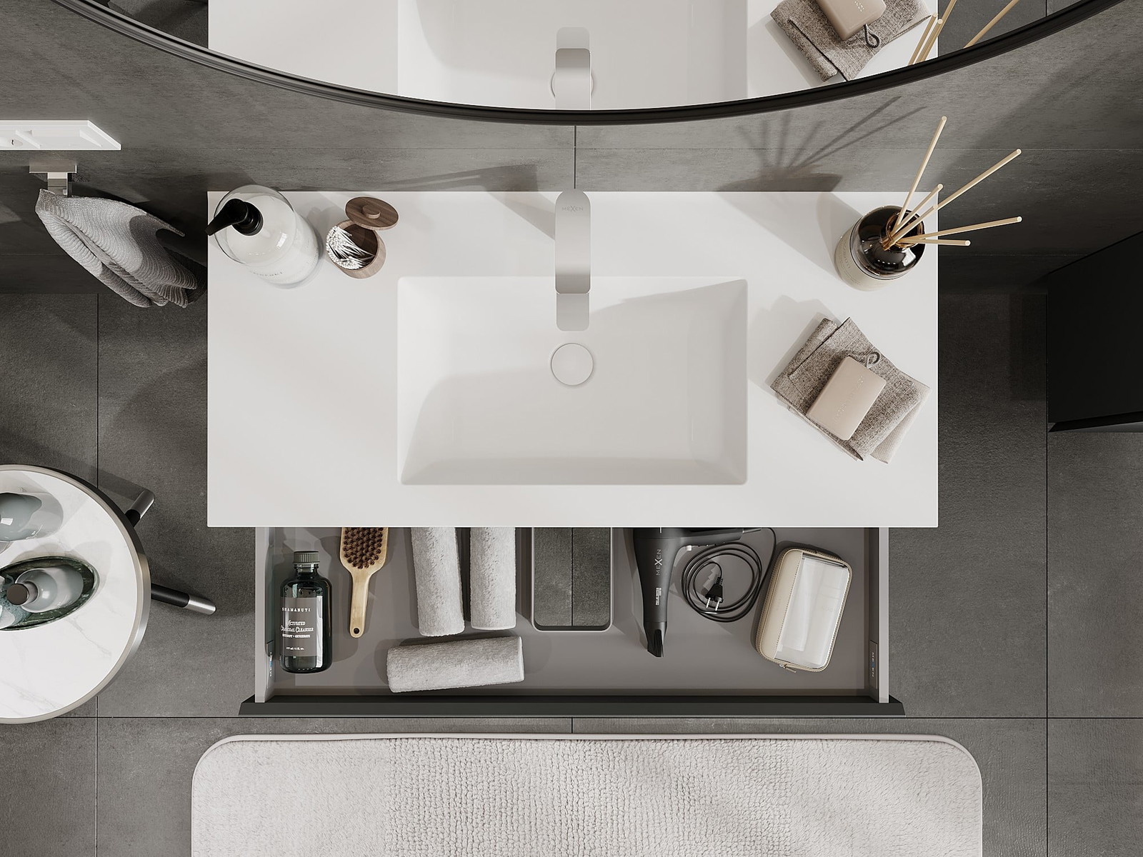 Izrez v predalu je zasnovan tako, da sprejme sifon, ki je nujen v umivalniških instalacijah. S tem je mogoče pohištvo popolnoma funkcionalno namestiti, ne da bi se morali odpovedati prostoru v predalu zaradi instalacije.