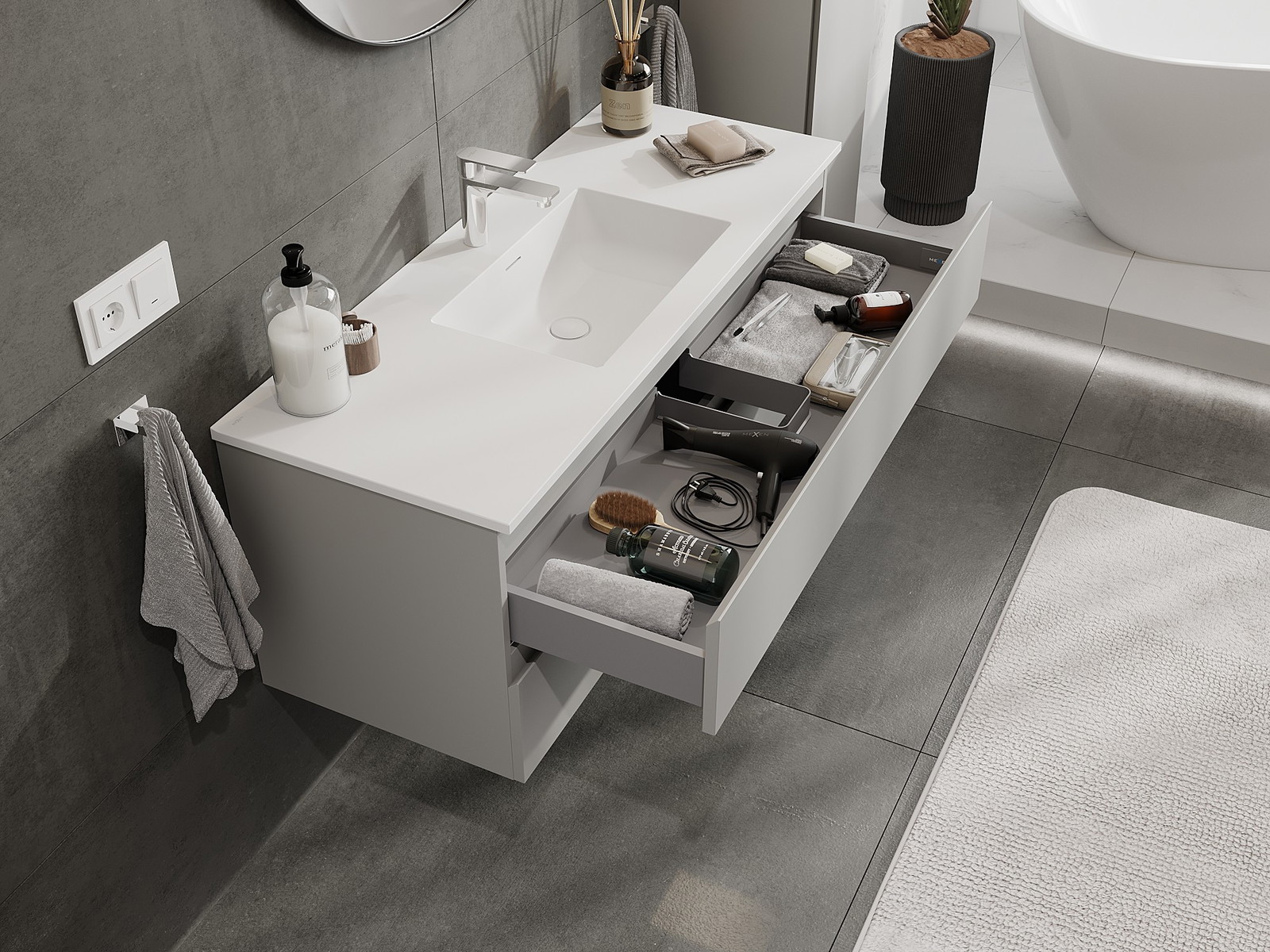 Izrez v predalu je zasnovan tako, da sprejme sifon, ki je nujen v umivalniških instalacijah. S tem je mogoče pohištvo popolnoma funkcionalno namestiti, ne da bi se morali odpovedati prostoru v predalu zaradi instalacije.
