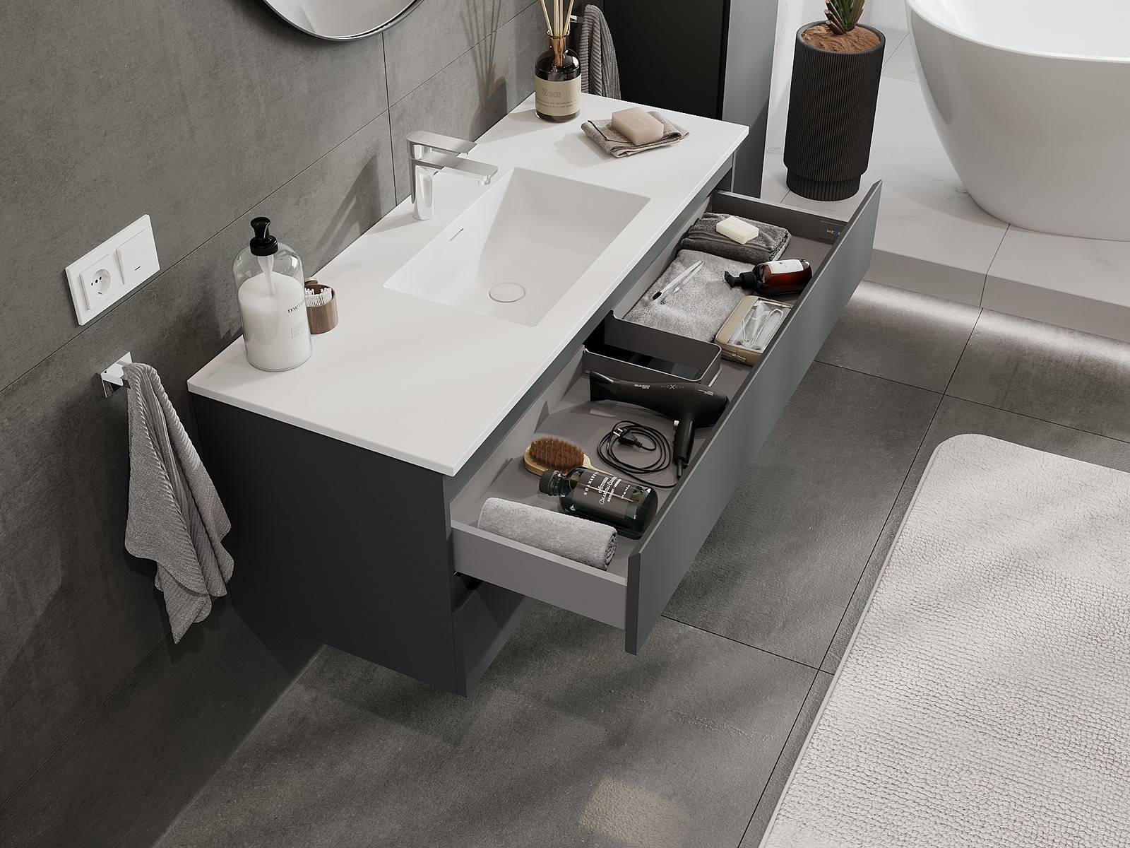 Izrez v predalu je zasnovan tako, da sprejme sifon, ki je nujen v umivalniških instalacijah. S tem je mogoče pohištvo popolnoma funkcionalno namestiti, ne da bi se morali odpovedati prostoru v predalu zaradi instalacije.