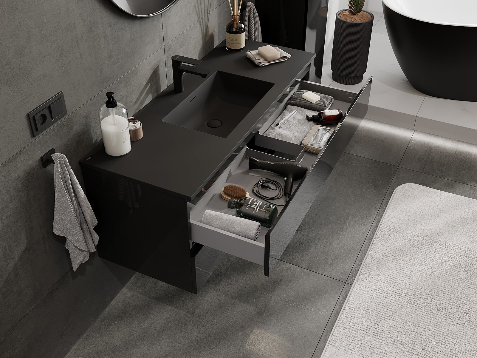 Izrez v predalu je zasnovan tako, da sprejme sifon, ki je nujen v umivalniških instalacijah. S tem je mogoče pohištvo popolnoma funkcionalno namestiti, ne da bi se morali odpovedati prostoru v predalu zaradi instalacije.