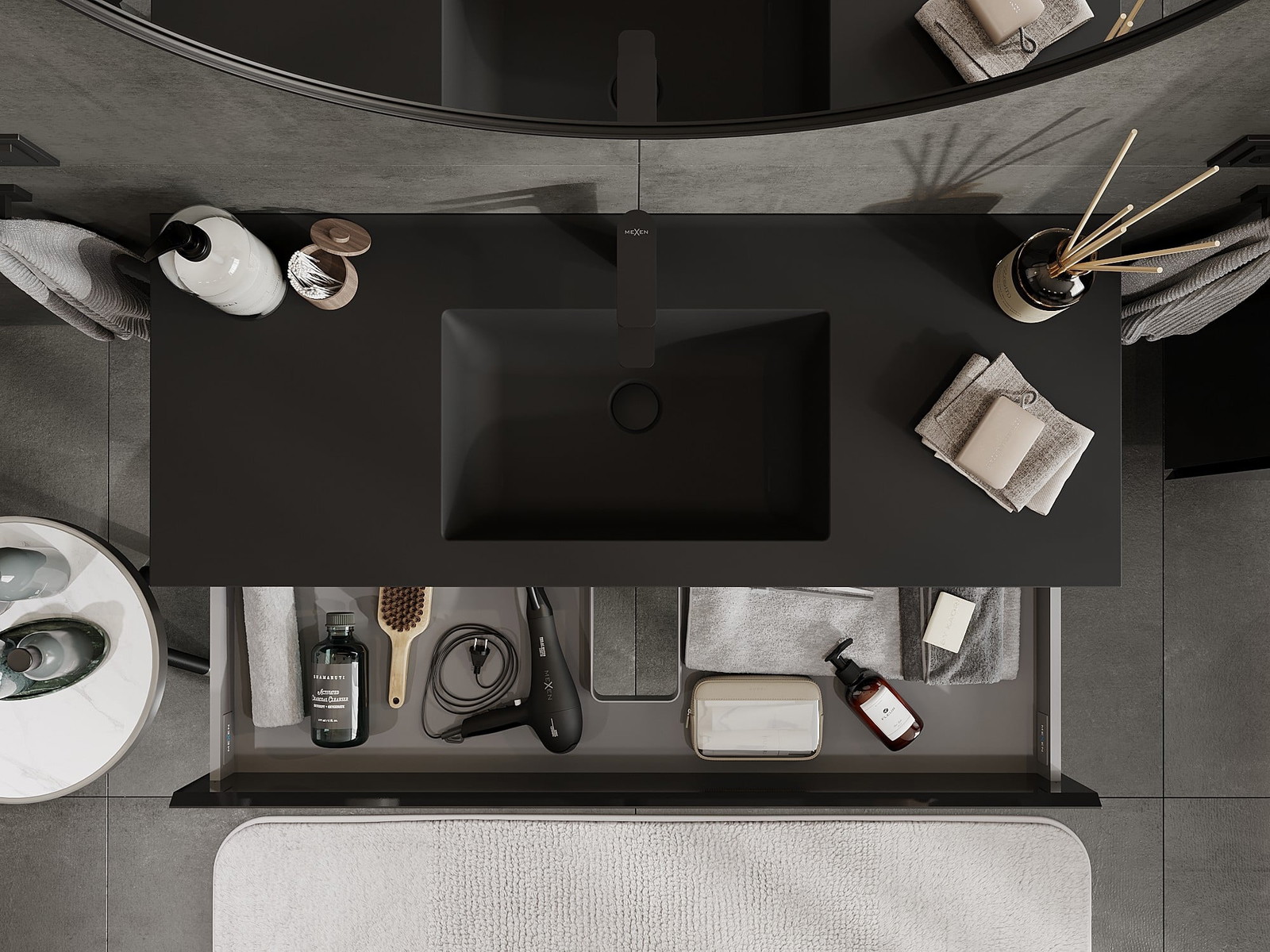 Mexen Orio kopalniška omarica 120 cm z umivalnikom Otis, 2 predala, črna sijaj/mat črna - 91A10-12047-2-BFF70-W18M71