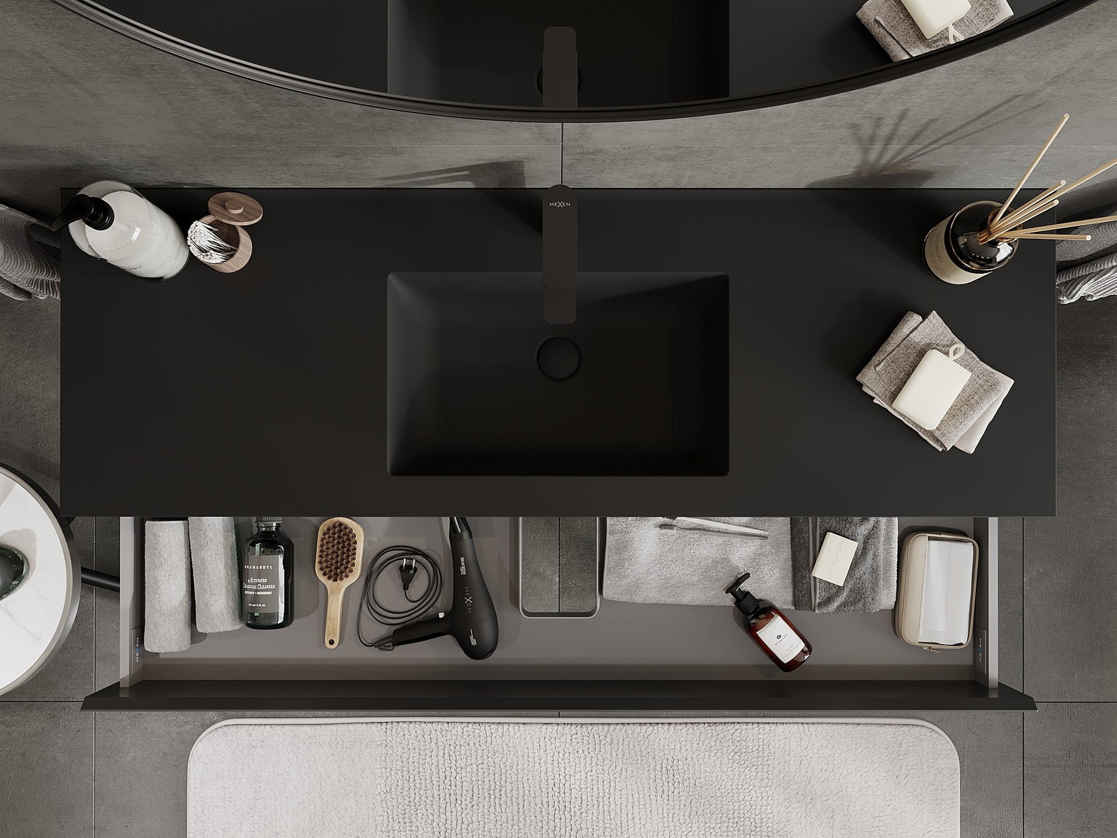 Mexen Orio kopalniška omarica 140 cm z umivalnikom Otis, 2 predala, črna mat - 91A10-14047-2-BFF71-W18M71