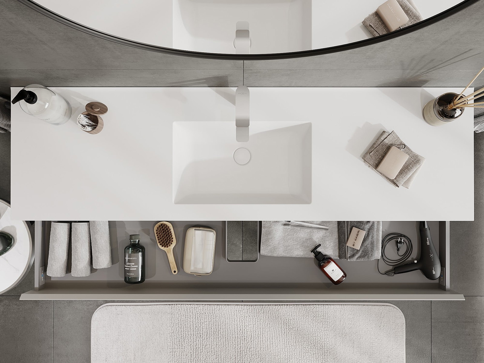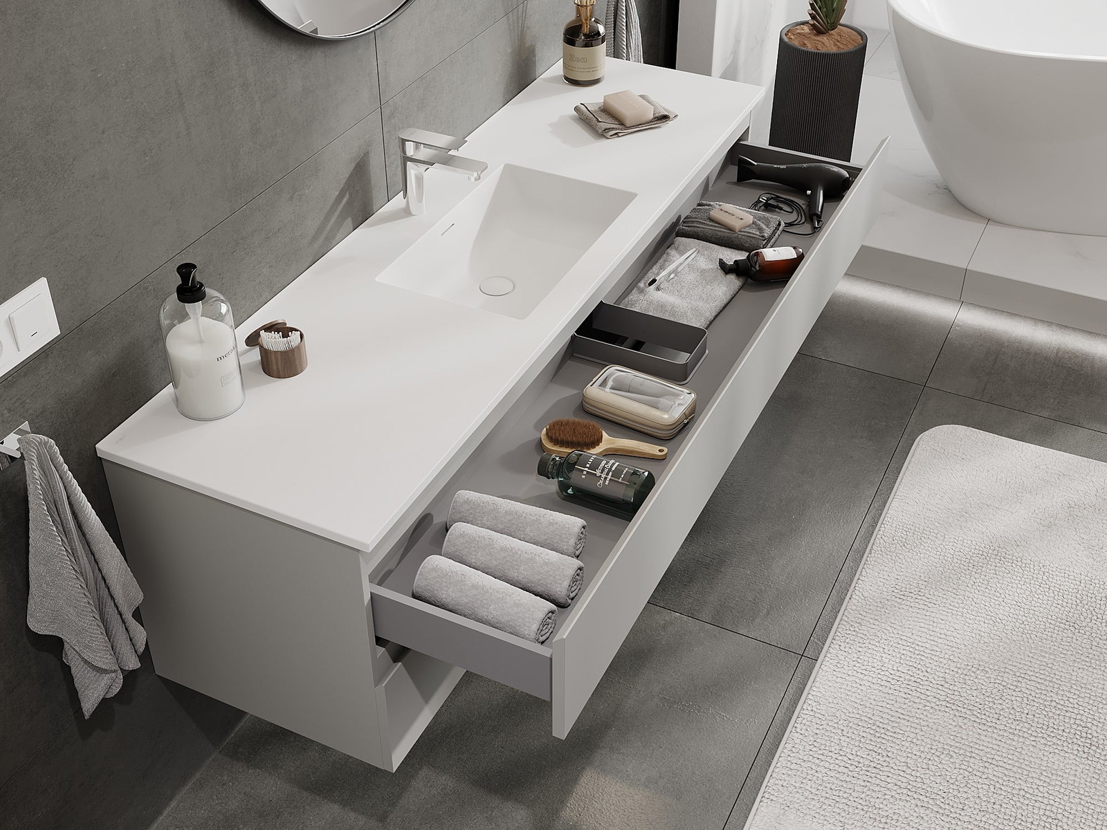 Izrez v predalu je zasnovan tako, da sprejme sifon, ki je nujen v umivalniških instalacijah. S tem je mogoče pohištvo popolnoma funkcionalno namestiti, ne da bi se morali odpovedati prostoru v predalu zaradi instalacije.
