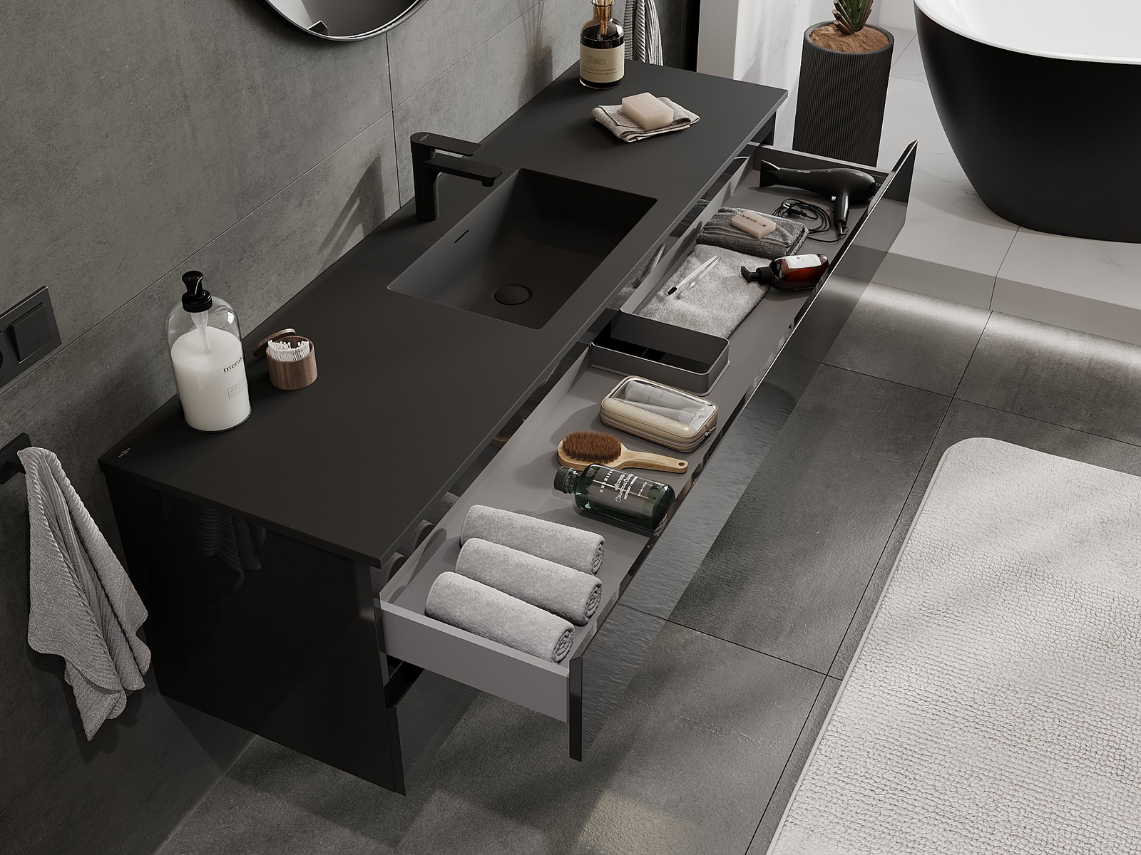 Izrez v predalu je zasnovan tako, da sprejme sifon, ki je nujen v umivalniških instalacijah. S tem je mogoče pohištvo popolnoma funkcionalno namestiti, ne da bi se morali odpovedati prostoru v predalu zaradi instalacije.