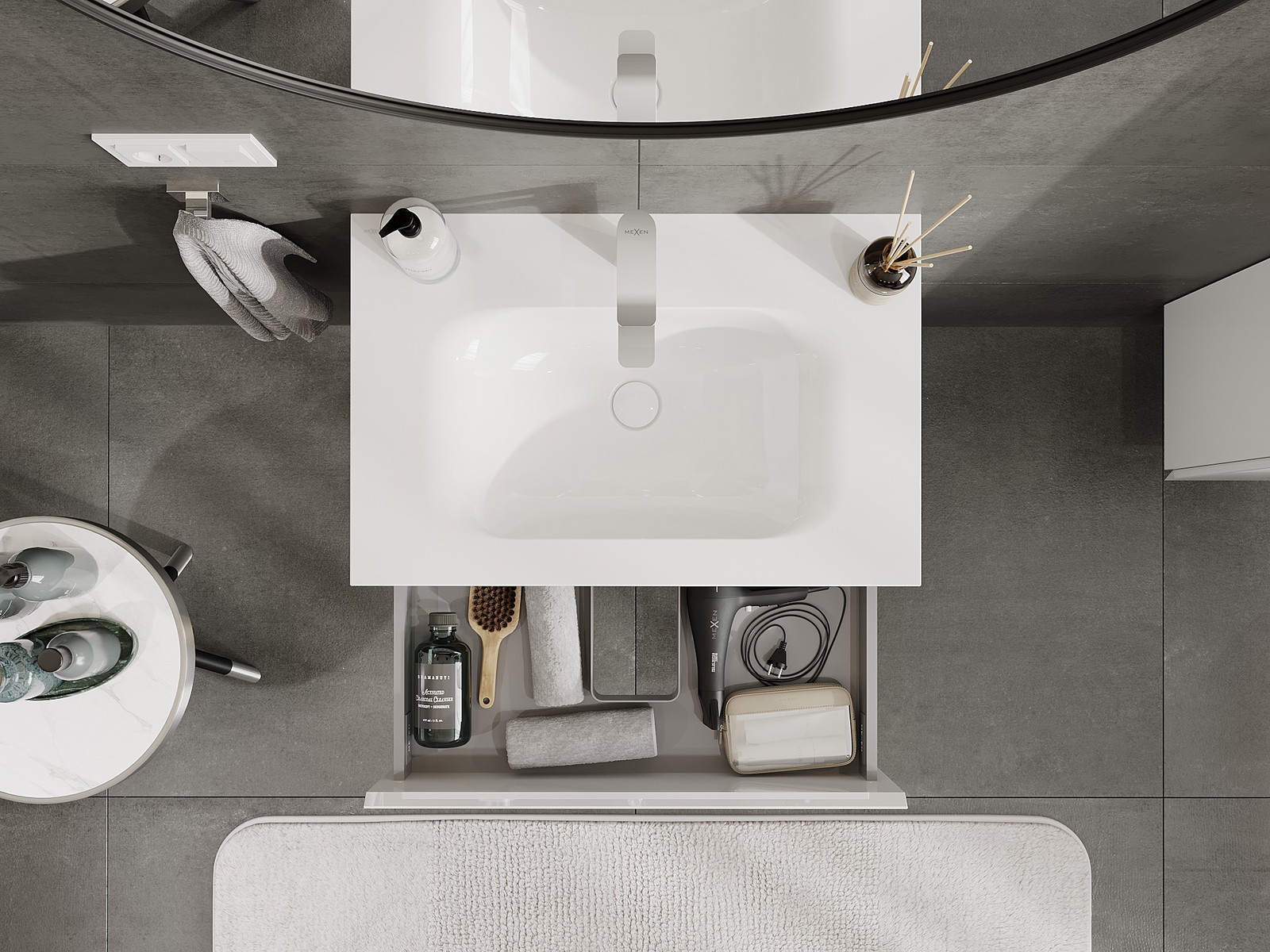 Izrez v predalu je zasnovan tako, da sprejme sifon, ki je nujen v umivalniških instalacijah. S tem je mogoče pohištvo popolnoma funkcionalno namestiti, ne da bi se morali odpovedati prostoru v predalu zaradi instalacije.