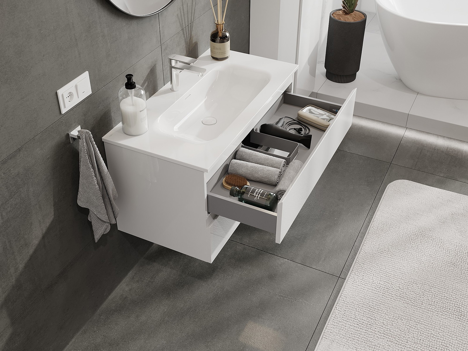 Naše modularno pohištvo za kopalnice je mogoče združevati v različnih barvnih konfiguracijah, kar omogoča popolno personalizacijo. Možno je izbrati tako videz kot funkcije posameznih elementov, kar omogoča prilagoditev pohištva vašim slogovnim in uporabniškim preferencam.