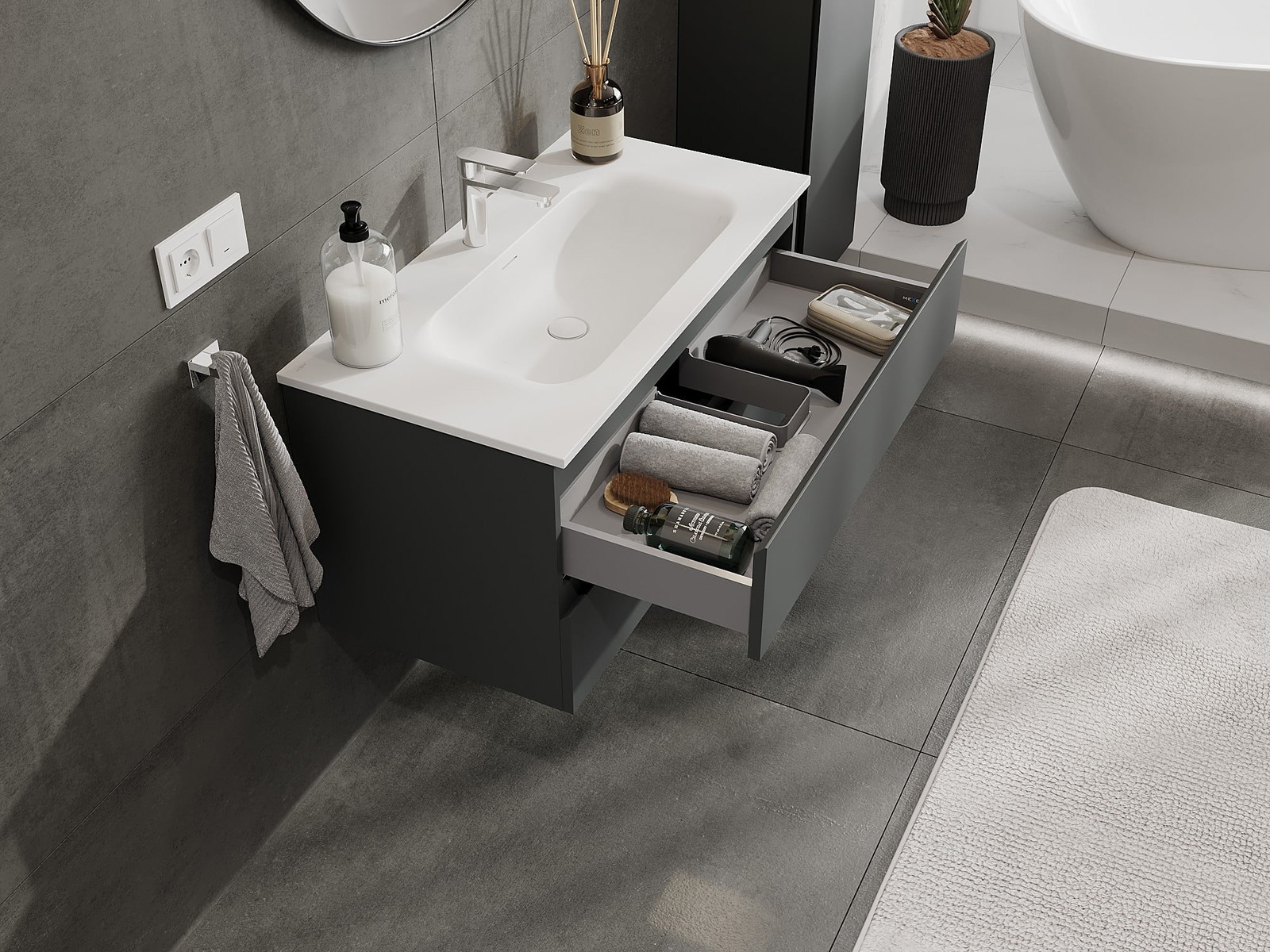 Izrez v predalu je zasnovan tako, da sprejme sifon, ki je nujen v umivalniških instalacijah. S tem je mogoče pohištvo popolnoma funkcionalno namestiti, ne da bi se morali odpovedati prostoru v predalu zaradi instalacije.