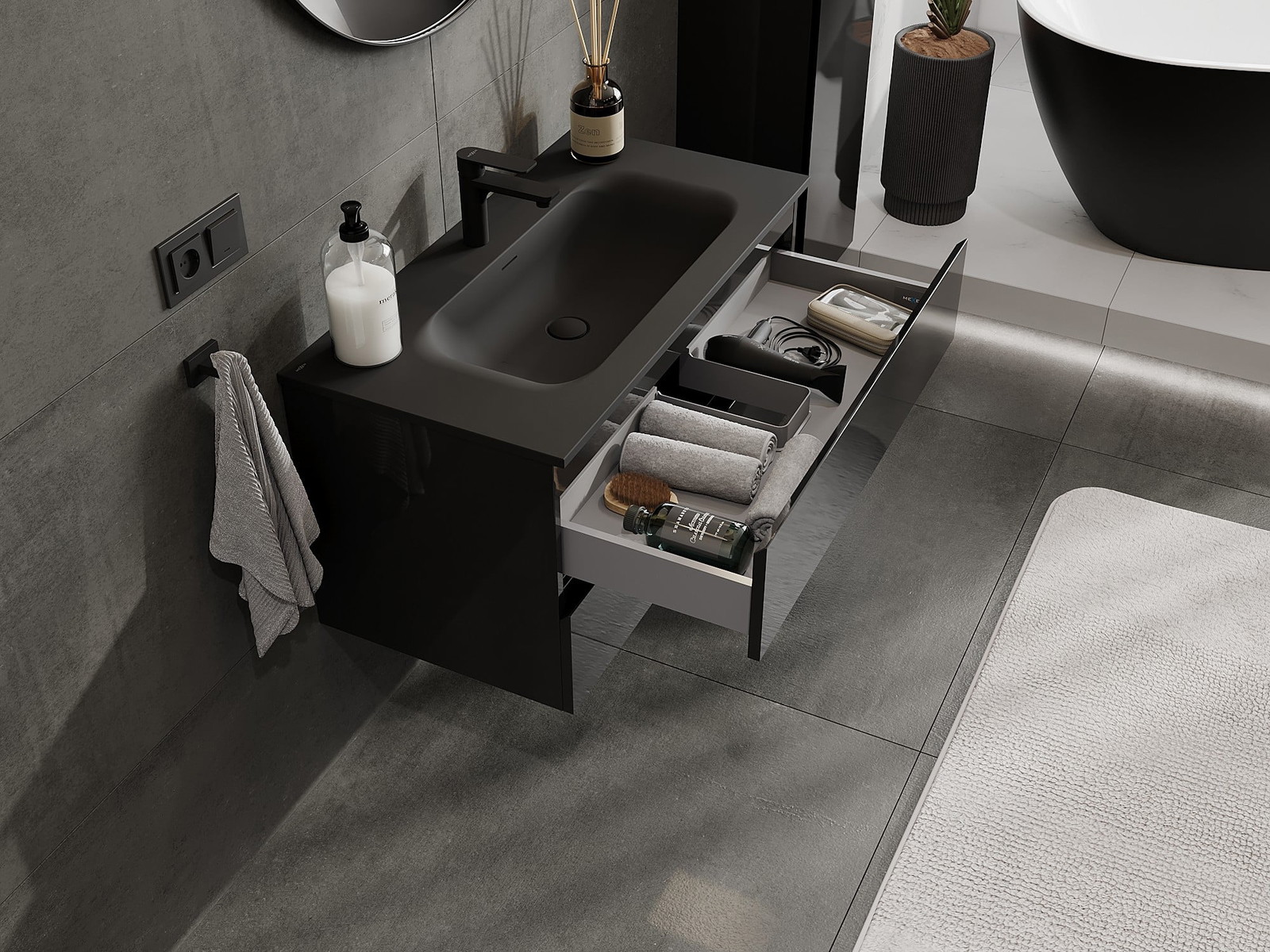 Izrez v predalu je zasnovan tako, da sprejme sifon, ki je nujen v umivalniških instalacijah. S tem je mogoče pohištvo popolnoma funkcionalno namestiti, ne da bi se morali odpovedati prostoru v predalu zaradi instalacije.