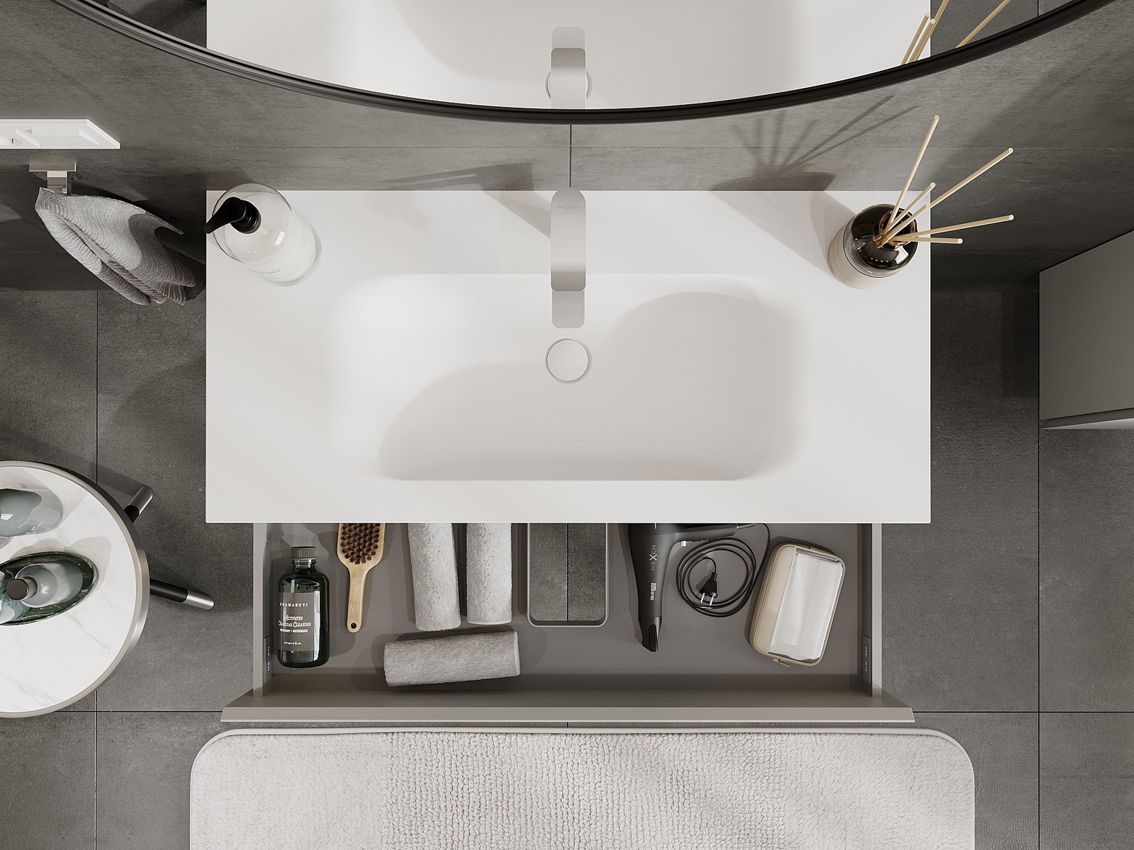 Izrez v predalu je zasnovan tako, da sprejme sifon, ki je nujen v umivalniških instalacijah. S tem je mogoče pohištvo popolnoma funkcionalno namestiti, ne da bi se morali odpovedati prostoru v predalu zaradi instalacije.