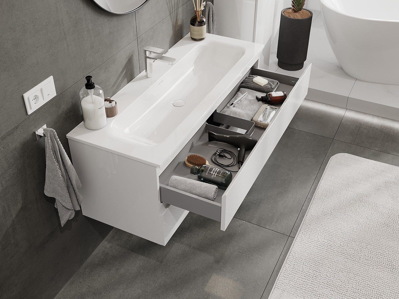 Izrez v predalu je zasnovan tako, da sprejme sifon, ki je nujen v umivalniških instalacijah. S tem je mogoče pohištvo popolnoma funkcionalno namestiti, ne da bi se morali odpovedati prostoru v predalu zaradi instalacije.