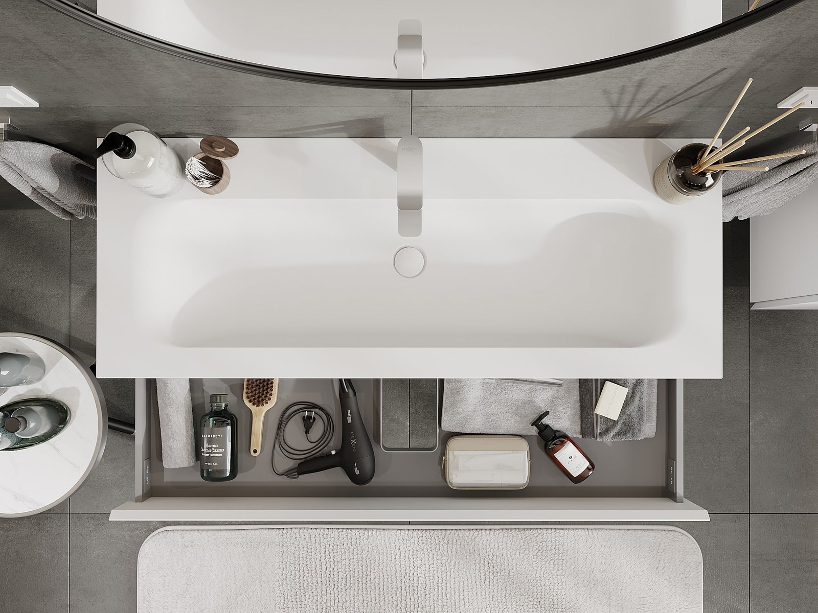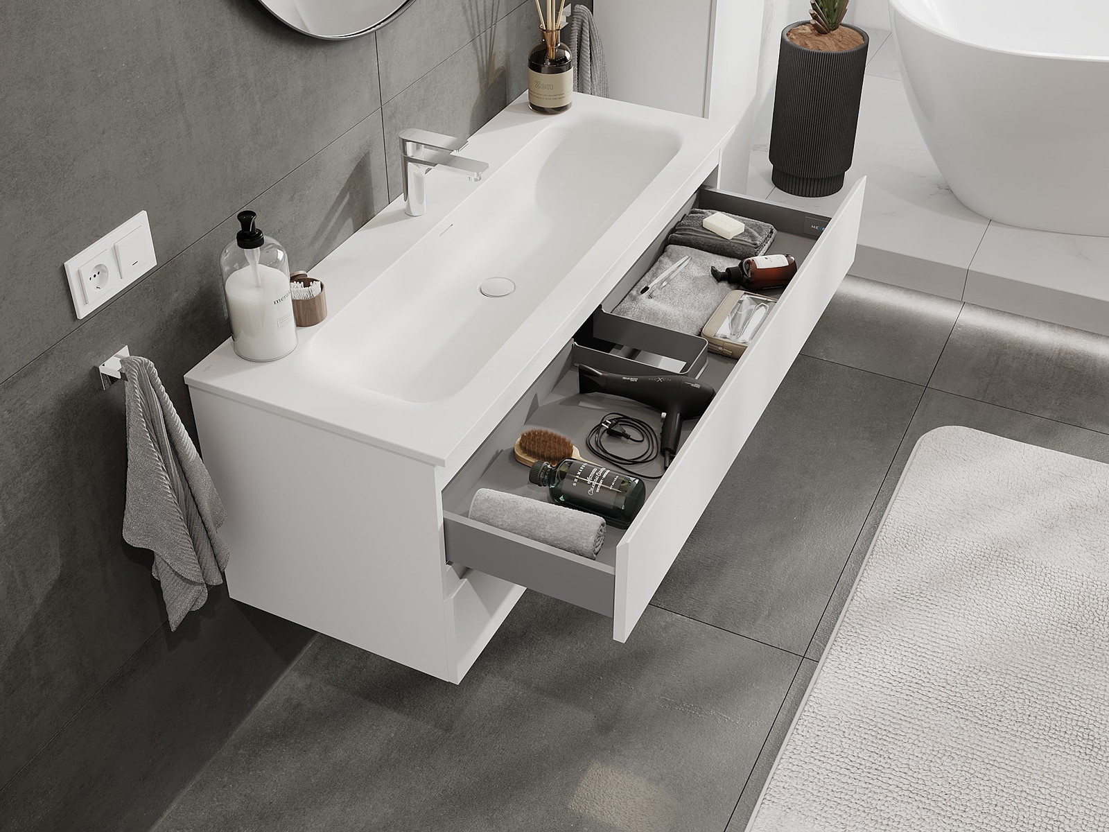 Izrez v predalu je zasnovan tako, da sprejme sifon, ki je nujen v umivalniških instalacijah. S tem je mogoče pohištvo popolnoma funkcionalno namestiti, ne da bi se morali odpovedati prostoru v predalu zaradi instalacije.