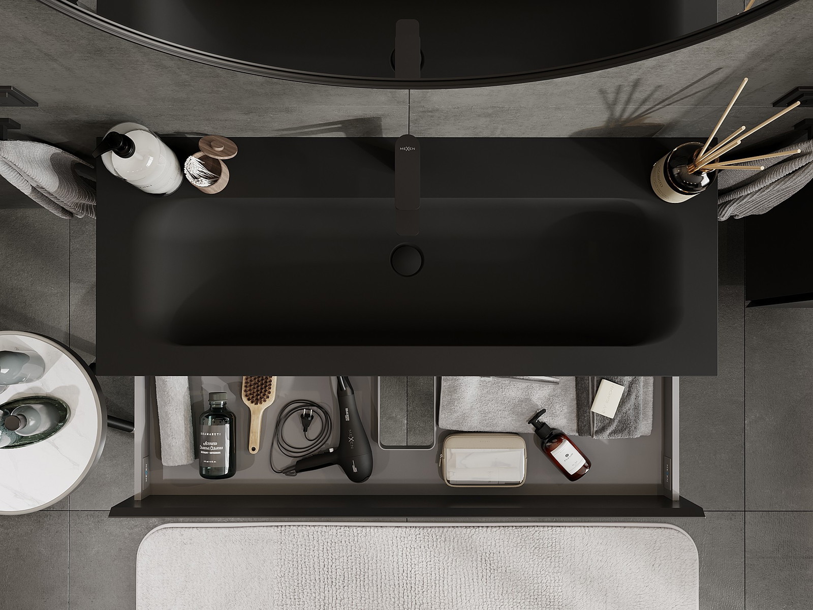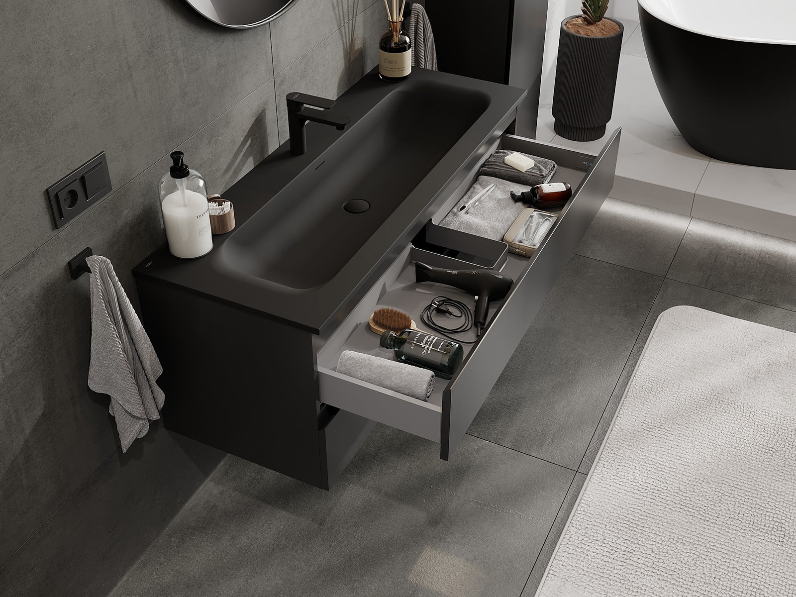 Izrez v predalu je zasnovan tako, da sprejme sifon, ki je nujen v umivalniških instalacijah. S tem je mogoče pohištvo popolnoma funkcionalno namestiti, ne da bi se morali odpovedati prostoru v predalu zaradi instalacije.