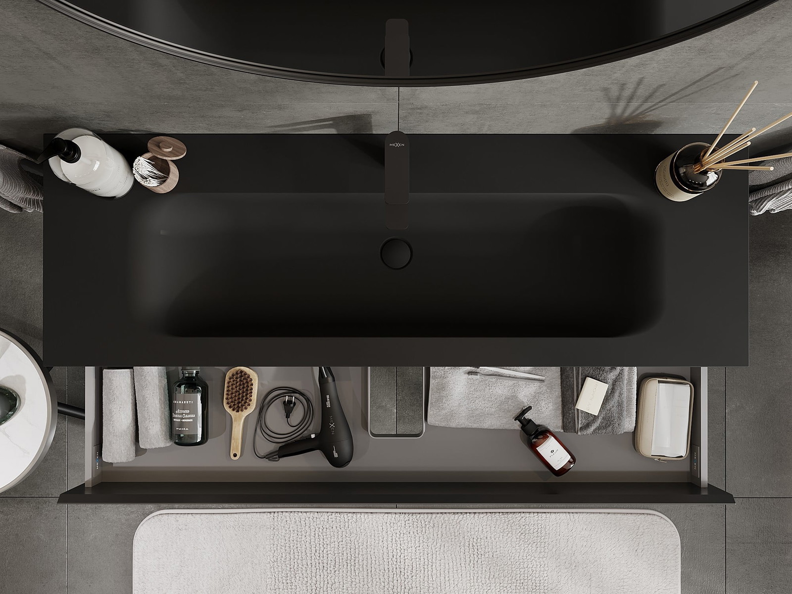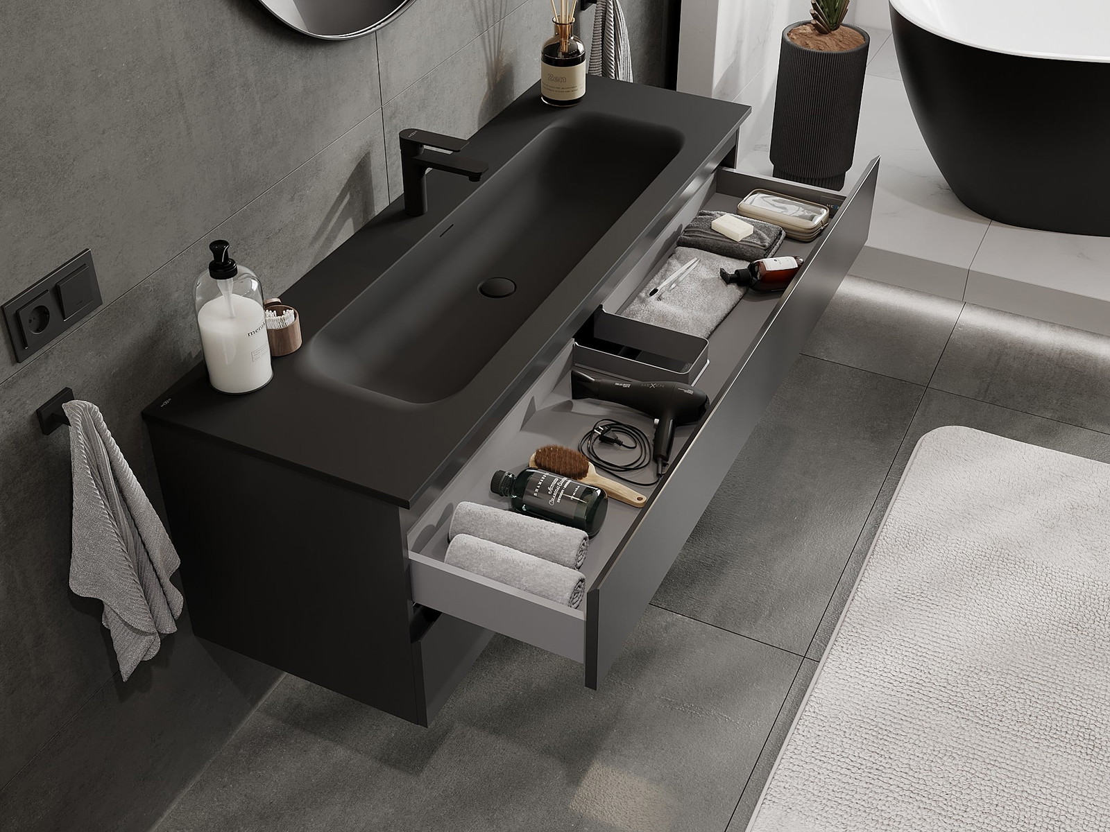 Izrez v predalu je zasnovan tako, da sprejme sifon, ki je nujen v umivalniških instalacijah. S tem je mogoče pohištvo popolnoma funkcionalno namestiti, ne da bi se morali odpovedati prostoru v predalu zaradi instalacije.