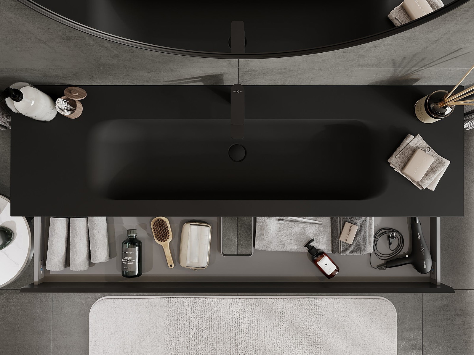 Izrez v predalu je zasnovan tako, da sprejme sifon, ki je nujen v umivalniških instalacijah. S tem je mogoče pohištvo popolnoma funkcionalno namestiti, ne da bi se morali odpovedati prostoru v predalu zaradi instalacije.