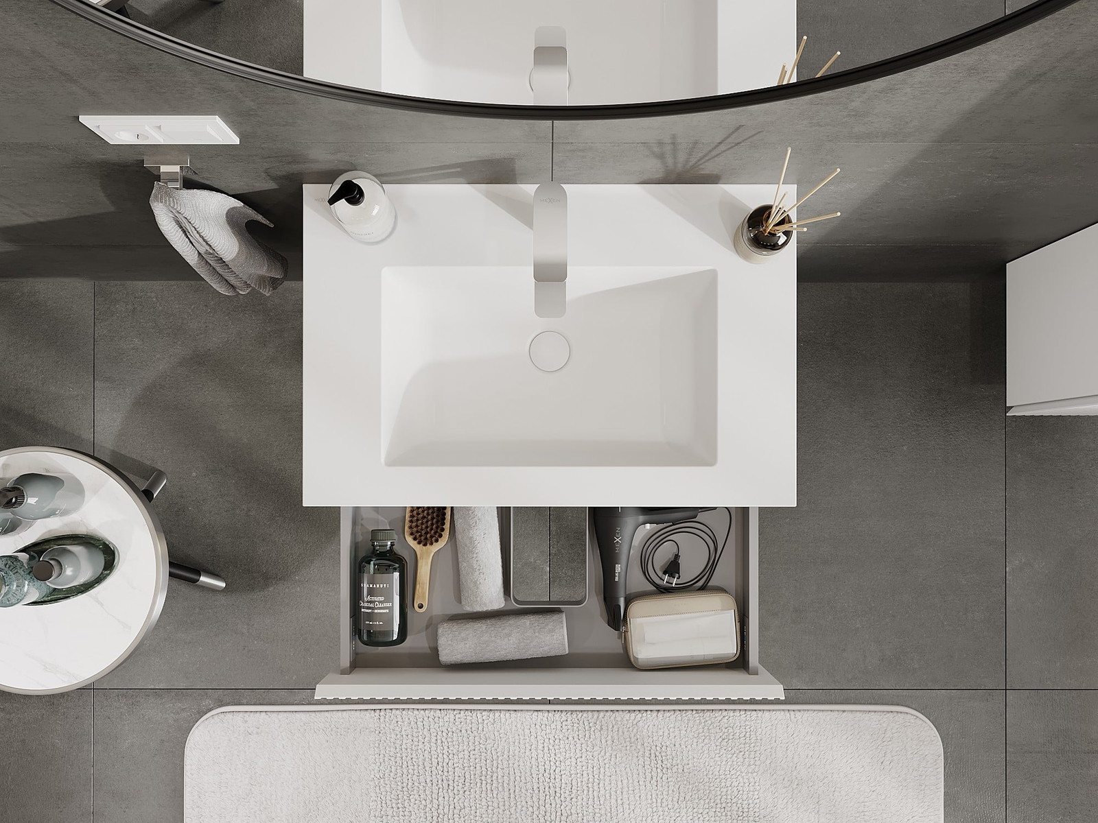 Izrez v predalu je zasnovan tako, da sprejme sifon, ki je nujen v umivalniških instalacijah. S tem je mogoče pohištvo popolnoma funkcionalno namestiti, ne da bi se morali odpovedati prostoru v predalu zaradi instalacije.