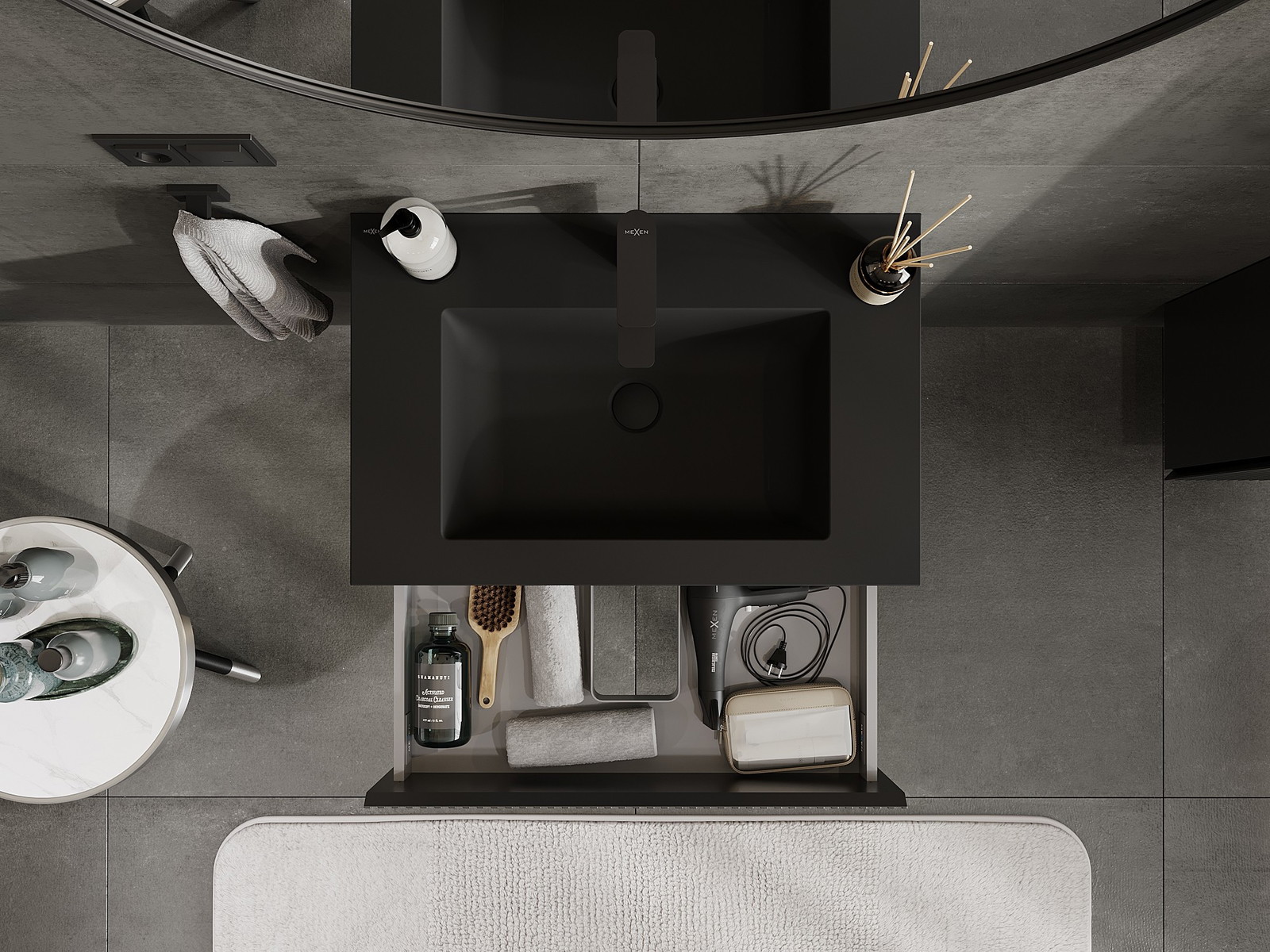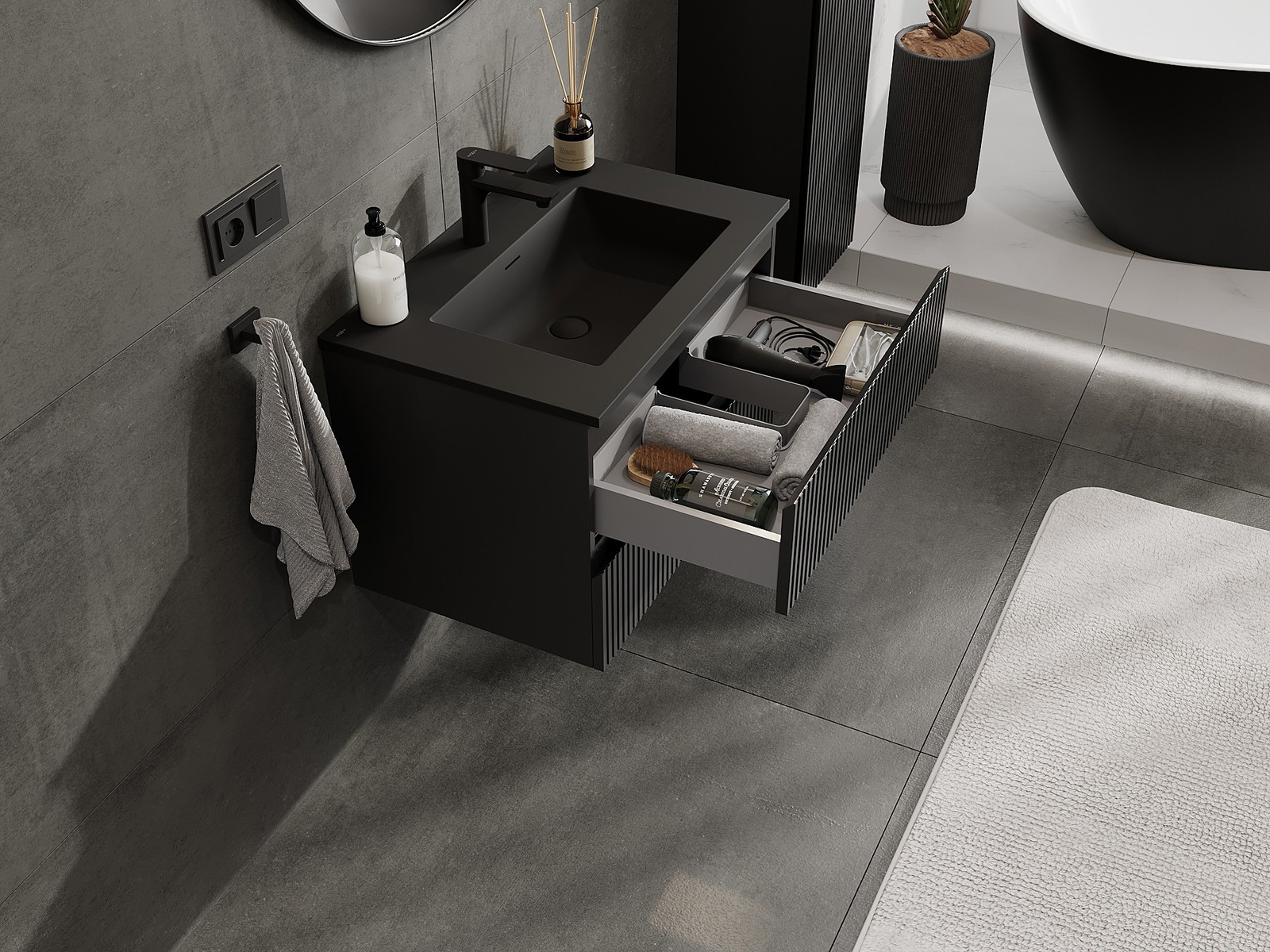 Mexen Rivel kopalniška omarica 70 cm z umivalnikom Otis, 2 predala, rebrasta, črna mat - 91A20-07047-2-BFF71-W18M71
