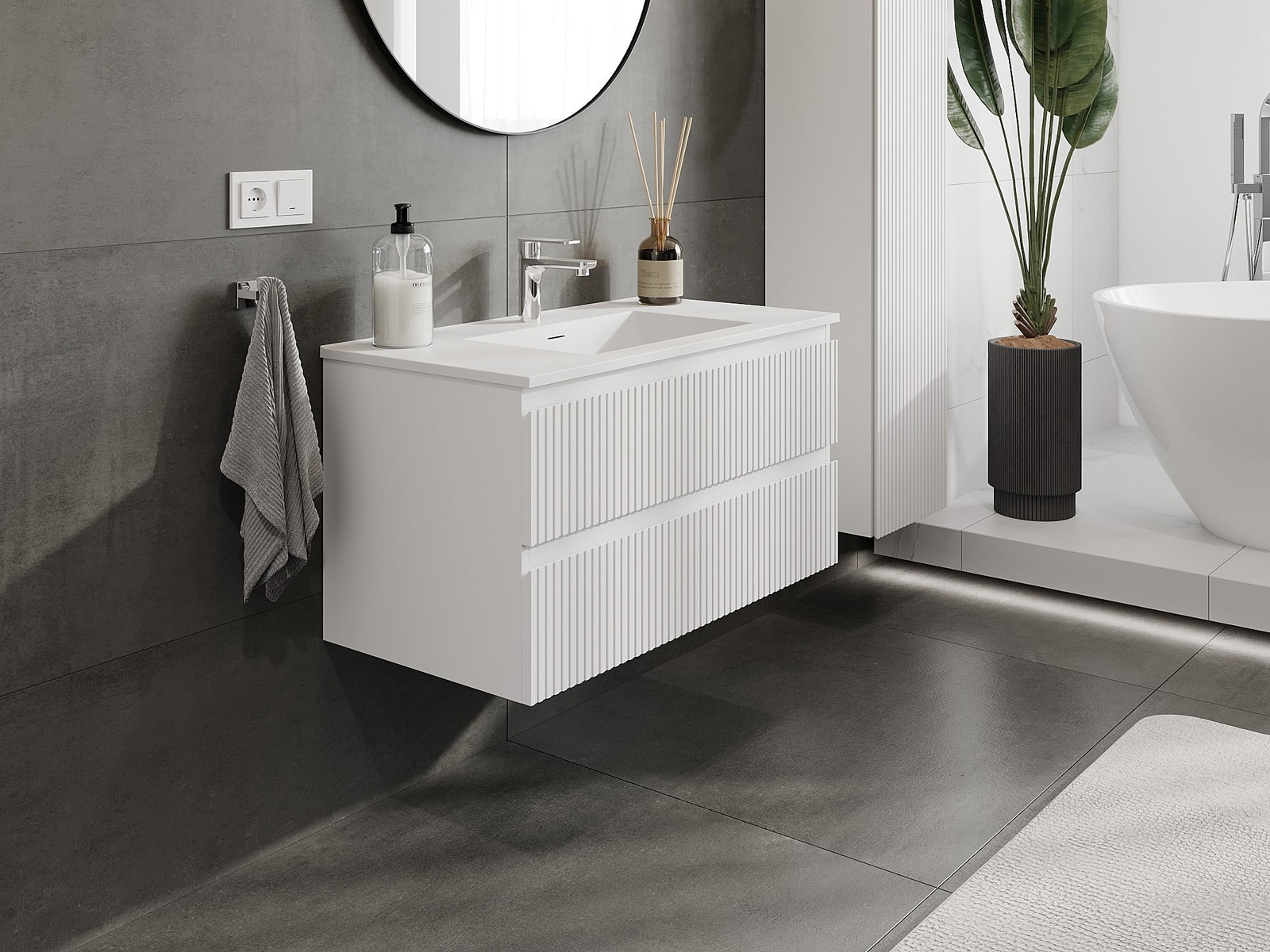 Mexen Rivel kopalna omarica 90 cm z umivalnikom Otis, 2 predali, rebrasta, bela mat - 91A20-09047-2-BFF01-W18M01