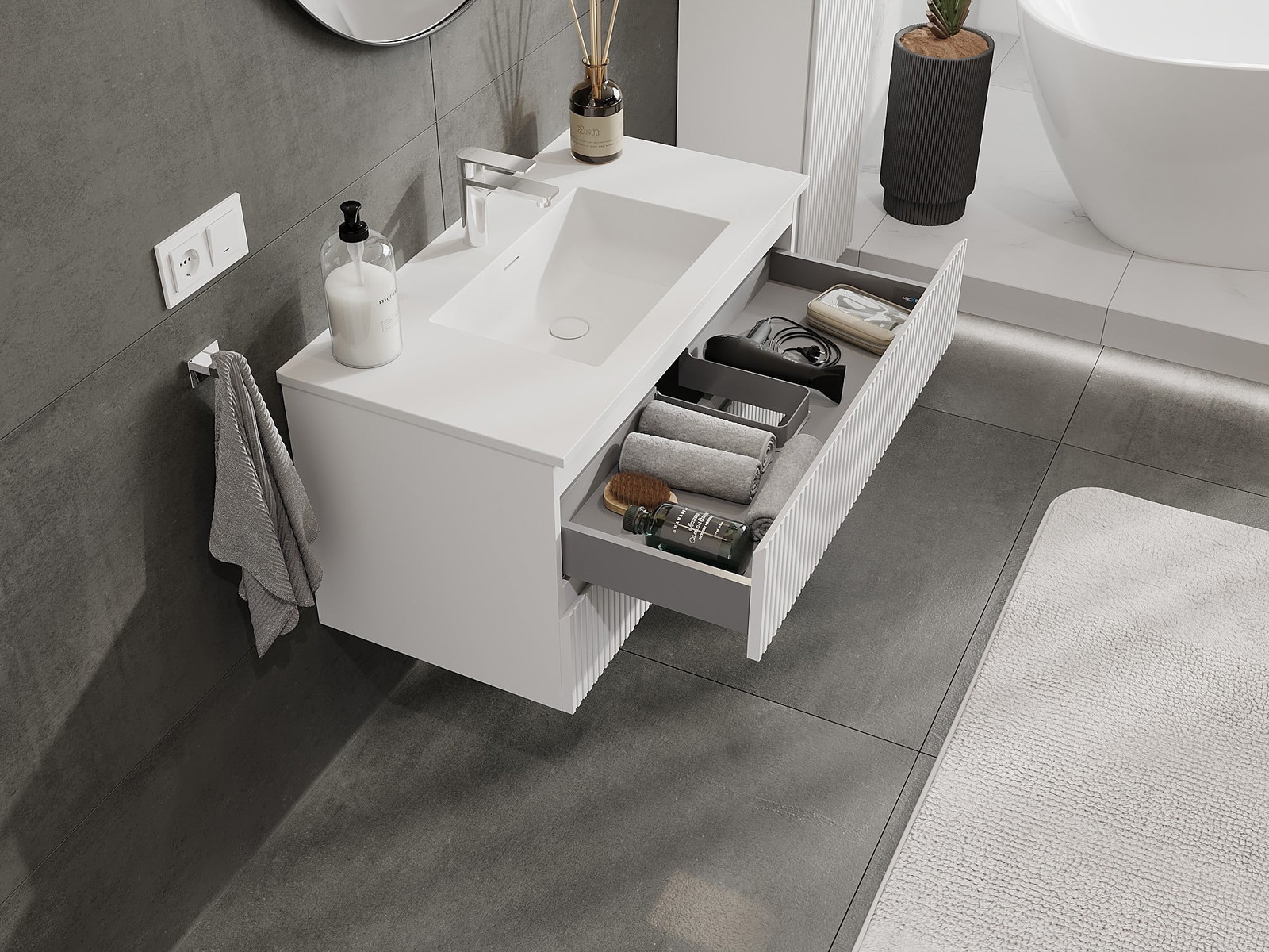 Izrez v predalu je zasnovan tako, da sprejme sifon, ki je nujen v umivalniških instalacijah. S tem je mogoče pohištvo popolnoma funkcionalno namestiti, ne da bi se morali odpovedati prostoru v predalu zaradi instalacije.