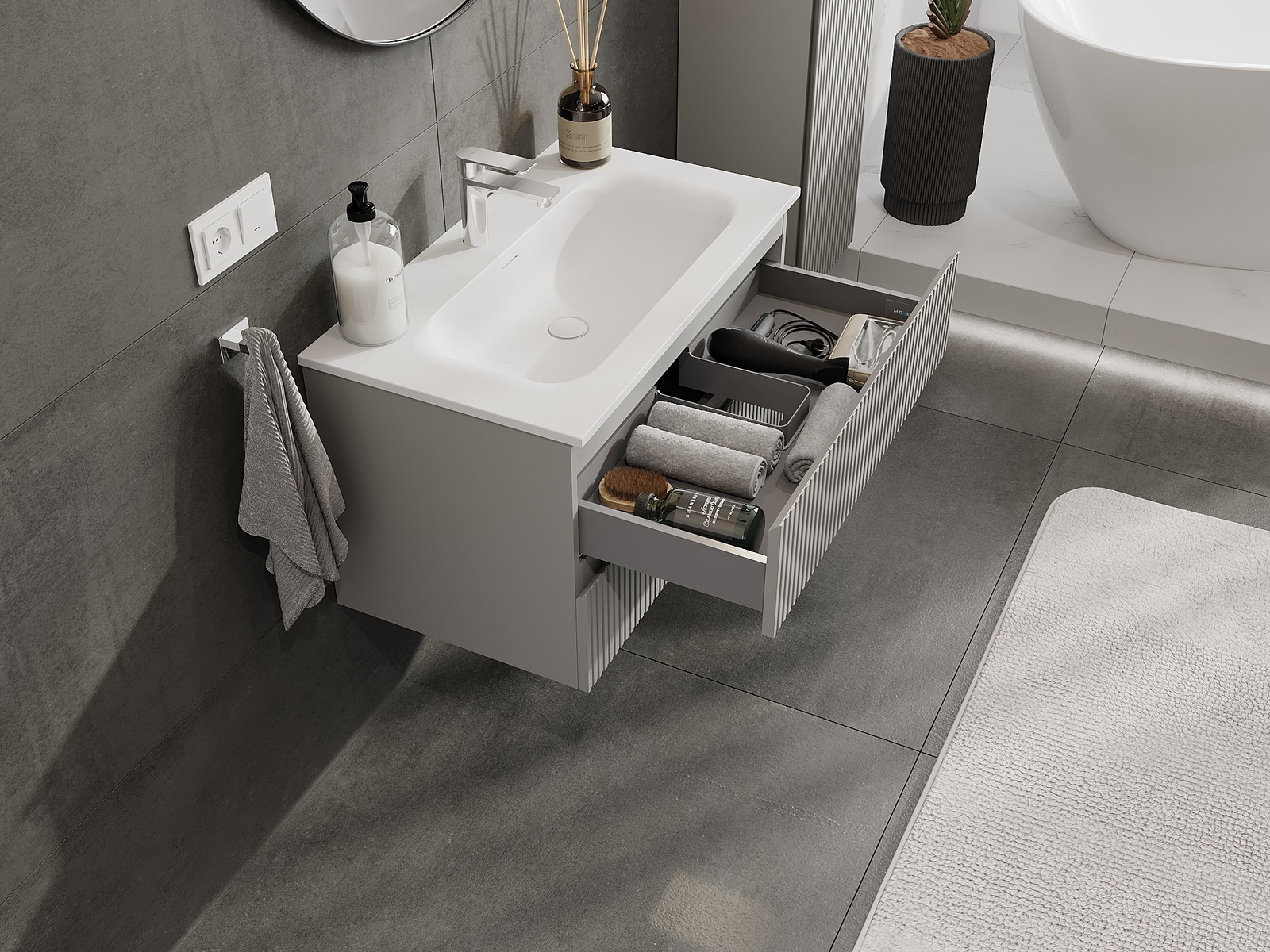 Izrez v predalu je zasnovan tako, da sprejme sifon, ki je nujen v umivalniških instalacijah. S tem je mogoče pohištvo popolnoma funkcionalno namestiti, ne da bi se morali odpovedati prostoru v predalu zaradi instalacije.