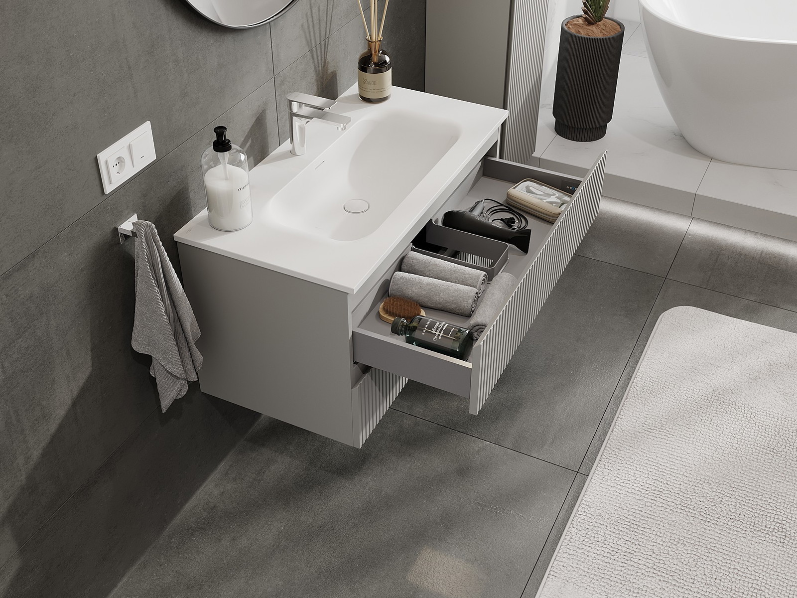 Izrez v predalu je zasnovan tako, da sprejme sifon, ki je nujen v umivalniških instalacijah. S tem je mogoče pohištvo popolnoma funkcionalno namestiti, ne da bi se morali odpovedati prostoru v predalu zaradi instalacije.