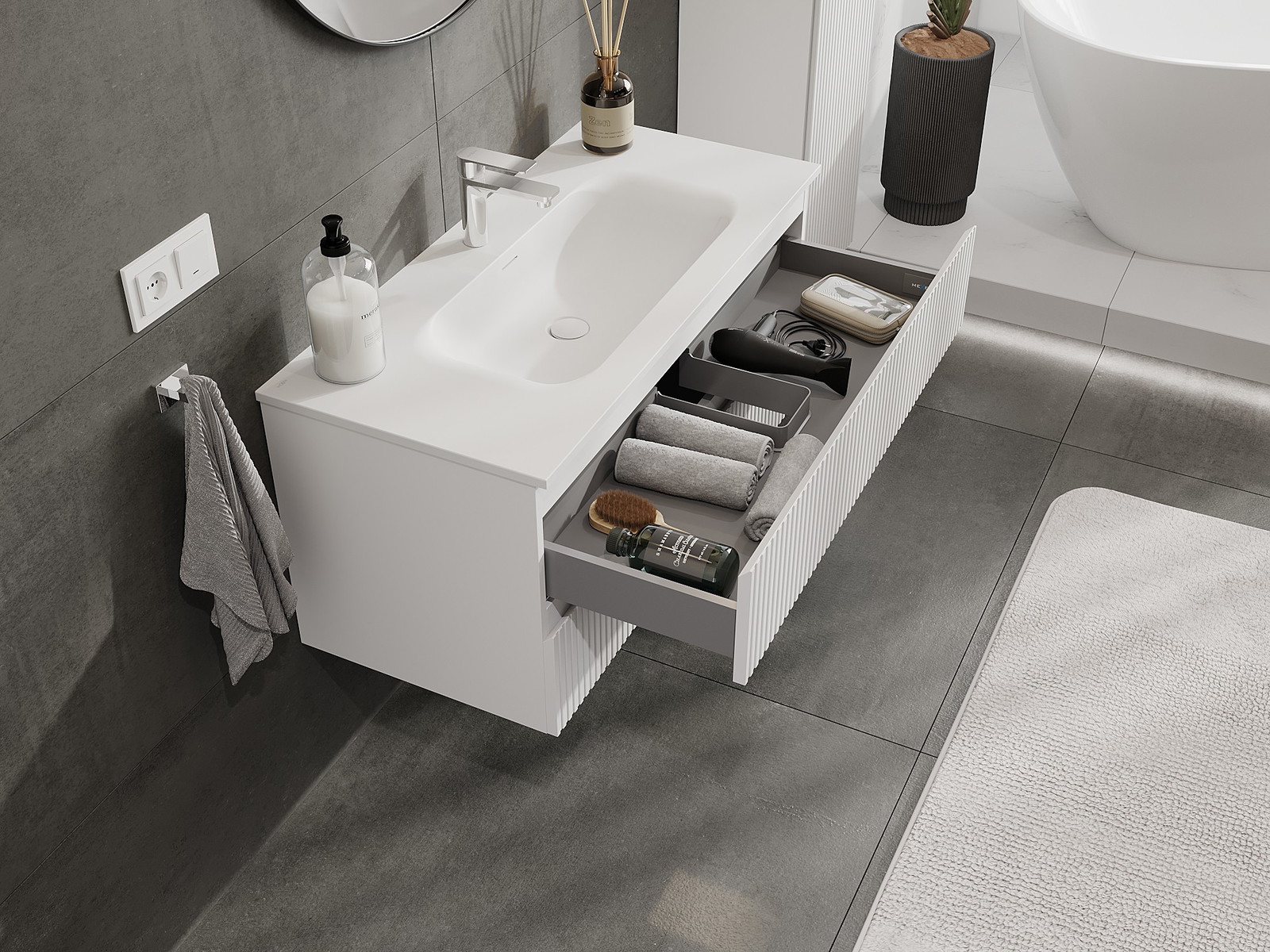 Izrez v predalu je zasnovan tako, da sprejme sifon, ki je nujen v umivalniških instalacijah. S tem je mogoče pohištvo popolnoma funkcionalno namestiti, ne da bi se morali odpovedati prostoru v predalu zaradi instalacije.