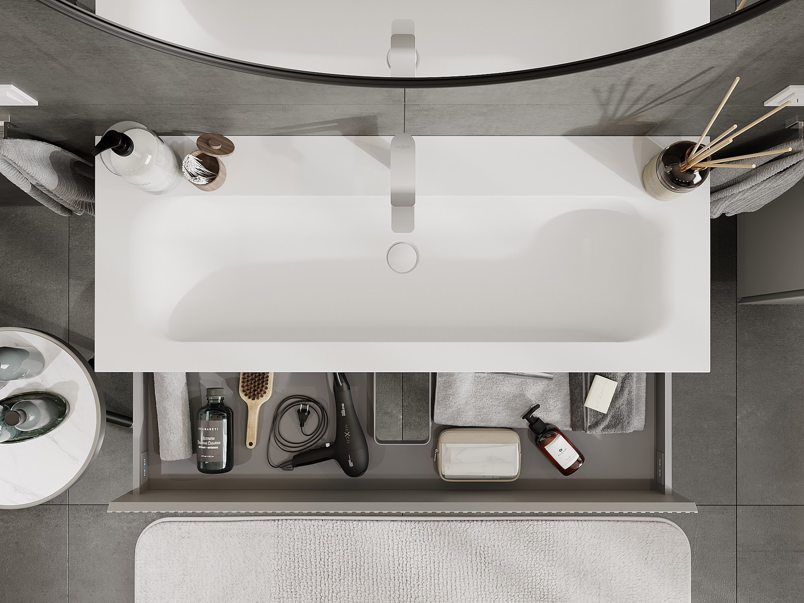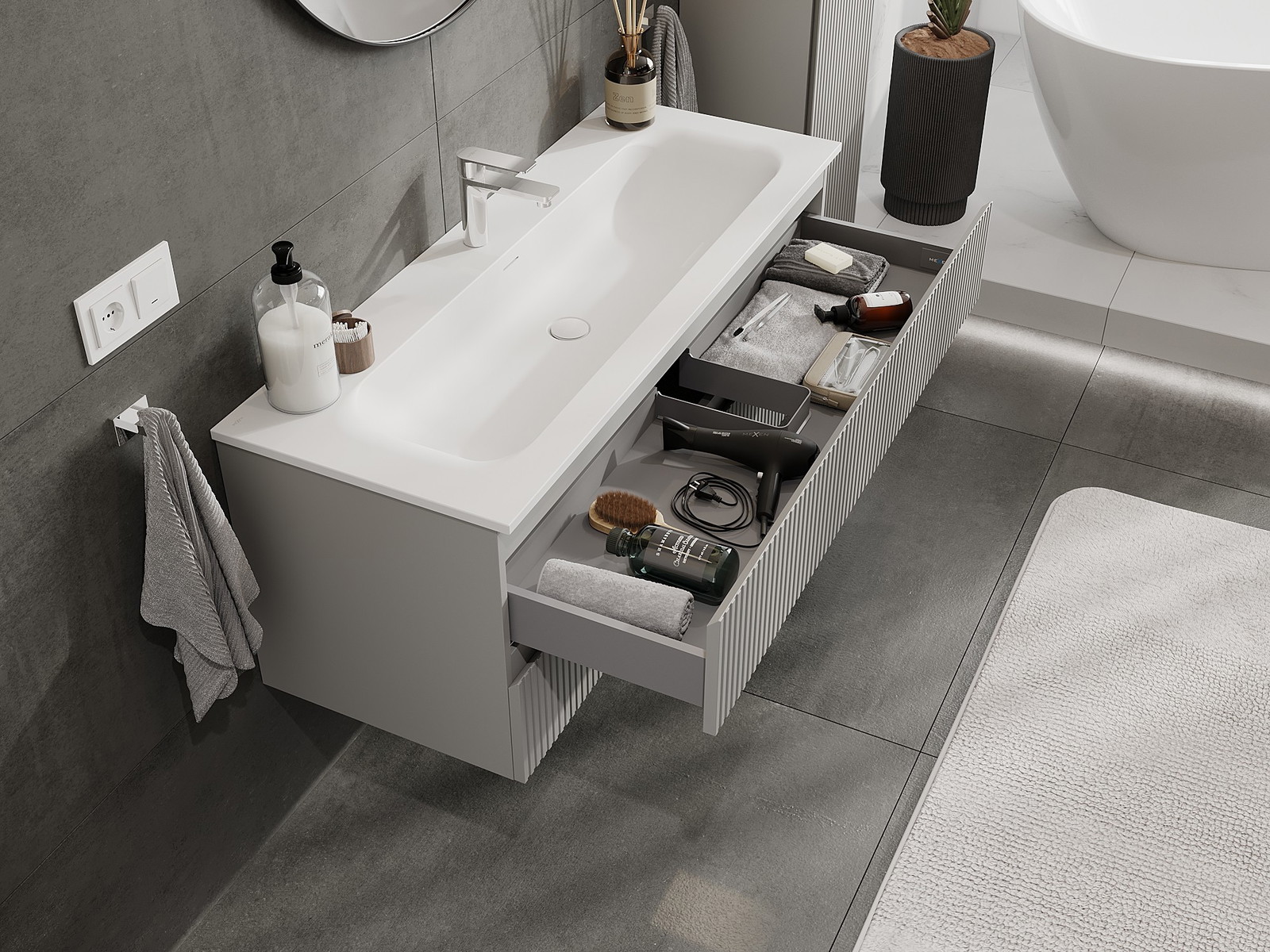 Izrez v predalu je zasnovan tako, da sprejme sifon, ki je nujen v umivalniških instalacijah. S tem je mogoče pohištvo popolnoma funkcionalno namestiti, ne da bi se morali odpovedati prostoru v predalu zaradi instalacije.